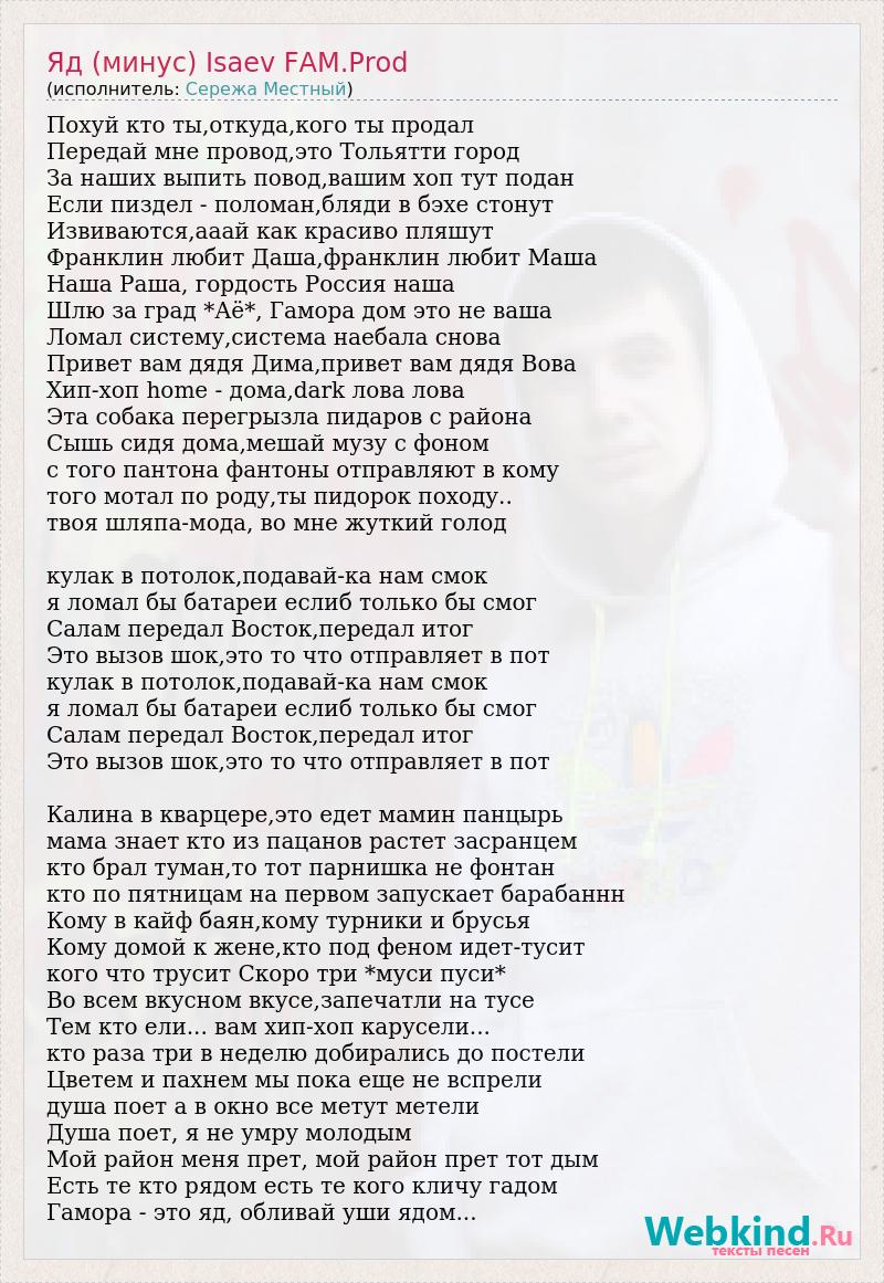 Похуй кто ты,откуда,кого ты продал Передай мне провод,это Тольятти город За наших выпить повод,вашим хоп тут подан Если пиздел - поломан,бляди в бэхе стонут Извиваются,ааай как красиво пляшут Франклин любит Даша,франклин любит Маша Наша Раша, гордость Россия наша Шлю за град *Аё*, Гамора дом это не ваша Ломал систему,система наебала снова Привет вам дядя Дима,привет вам дядя Вова Хип-хоп homе - дома,dark лова лова Эта собака перегрызла пидаров с района Сышь сидя дома,мешай музу с фоном с того пантона фантоны отправляют в кому того мотал по роду,ты пидорок походу.. твоя шляпа-мода, во мне жуткий голод кулак в потолок,подавай-ка нам смок я ломал бы батареи еслиб только бы смог Салам передал Восток,передал итог Это вызов шок,это то что отправляет в пот кулак в потолок,подавай-ка нам смок я ломал бы батареи еслиб только бы смог Салам передал Восток,передал итог Это вызов шок,это то что отправляет в пот Калина в кварцере,это едет мамин панцырь мама знает кто из пацанов растет засранцем кто брал туман,то тот парнишка не фонтан кто по пятницам на первом запускает барабаннн Кому в кайф баян,кому турники и брусья Кому домой к жене,кто под феном идет-тусит кого что трусит Скоро три *муси пуси* Во всем вкусном вкусе,запечатли на тусе Тем кто ели... вам хип-хоп карусели... кто раза три в неделю добирались до постели Цветем и пахнем мы пока еще не вспрели душа поет а в окно все метут метели Душа поет, я не умру молодым Мой район меня прет, мой район прет тот дым Есть те кто рядом есть те кого кличу гадом Гамора - это яд, обливай уши ядом...