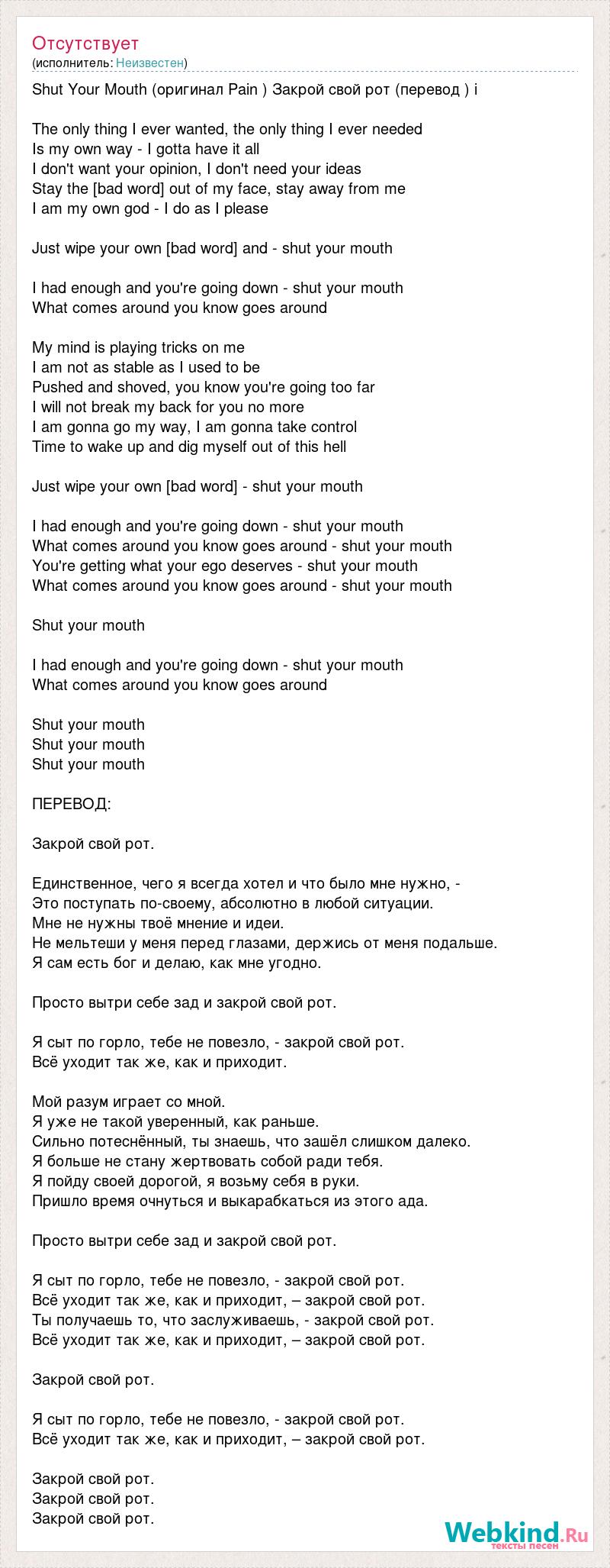 Shut Your Mouth (оригинал Pain ) Закрой свой рот (перевод ) i The only thing I ever wanted, the only thing I ever needed Is my own way - I gotta have it all I don't want your opinion, I don't need your ideas Stay the [bad word] out of my face, stay away from me I am my own god - I do as I please Just wipe your own [bad word] and - shut your mouth I had enough and you're going down - shut your mouth What comes around you know goes around My mind is playing tricks on me I am not as stable as I used to be Pushed and shoved, you know you're going too far I will not break my back for you no more I am gonna go my way, I am gonna take control Time to wake up and dig myself out of this hell Just wipe your own [bad word] - shut your mouth I had enough and you're going down - shut your mouth What comes around you know goes around - shut your mouth You're getting what your ego deserves - shut your mouth What comes around you know goes around - shut your mouth Shut your mouth I had enough and you're going down - shut your mouth What comes around you know goes around Shut your mouth Shut your mouth Shut your mouth ПЕРЕВОД: Закрой свой рот. Единственное, чего я всегда хотел и что было мне нужно, - Это поступать по-своему, абсолютно в любой ситуации. Мне не нужны твоё мнение и идеи. Не мельтеши у меня перед глазами, держись от меня подальше. Я сам есть бог и делаю, как мне угодно. Просто вытри себе зад и закрой свой рот. Я сыт по горло, тебе не повезло, - закрой свой рот. Всё уходит так же, как и приходит. Мой разум играет со мной. Я уже не такой уверенный, как раньше. Сильно потеснённый, ты знаешь, что зашёл слишком далеко. Я больше не стану жертвовать собой ради тебя. Я пойду своей дорогой, я возьму себя в руки. Пришло время очнуться и выкарабкаться из этого ада. Просто вытри себе зад и закрой свой рот. Я сыт по горло, тебе не повезло, - закрой свой рот. Всё уходит так же, как и приходит, – закрой свой рот. Ты получаешь то, что заслуживаешь, - закрой свой рот. Всё уходит так же, как и приходит, – закрой свой рот. Закрой свой рот. Я сыт по горло, тебе не повезло, - закрой свой рот. Всё уходит так же, как и приходит, – закрой свой рот. Закрой свой рот. Закрой свой рот. Закрой свой рот.