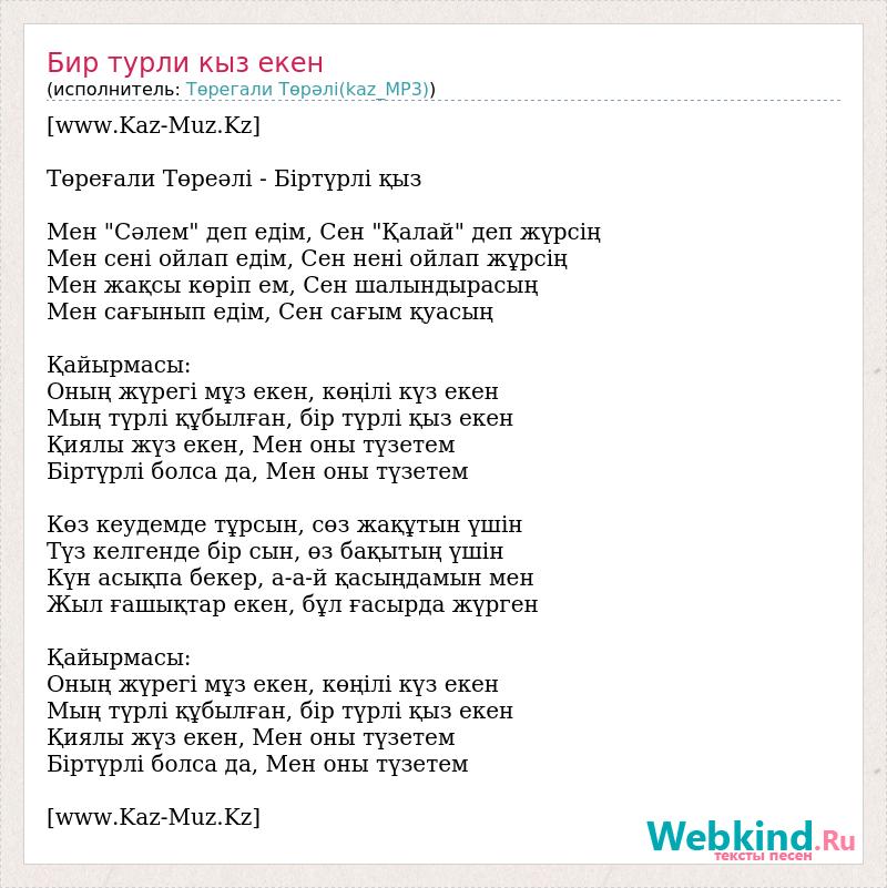 [www.Kaz-Muz.Kz] Төреғали Төреәлі - Біртүрлі қыз Мен "Сәлем" деп едім, Сен "Қалай" деп жүрсің Мен сені ойлап едім, Сен нені ойлап жұрсің Мен жақсы көріп ем, Сен шалындырасың Мен сағынып едім, Сен сағым қуасың Қайырмасы: Оның жүрегі мұз екен, көңілі күз екен Мың түрлі құбылған, бір түрлі қыз екен Қиялы жүз екен, Мен оны түзетем Біртүрлі болса да, Мен оны түзетем Көз кеудемде тұрсын, сөз жақұтын үшін Түз келгенде бір сын, өз бақытың үшін Күн асықпа бекер, а-а-й қасыңдамын мен Жыл ғашықтар екен, бұл ғасырда жүрген Қайырмасы: Оның жүрегі мұз екен, көңілі күз екен Мың түрлі құбылған, бір түрлі қыз екен Қиялы жүз екен, Мен оны түзетем Біртүрлі болса да, Мен оны түзетем [www.Kaz-Muz.Kz]