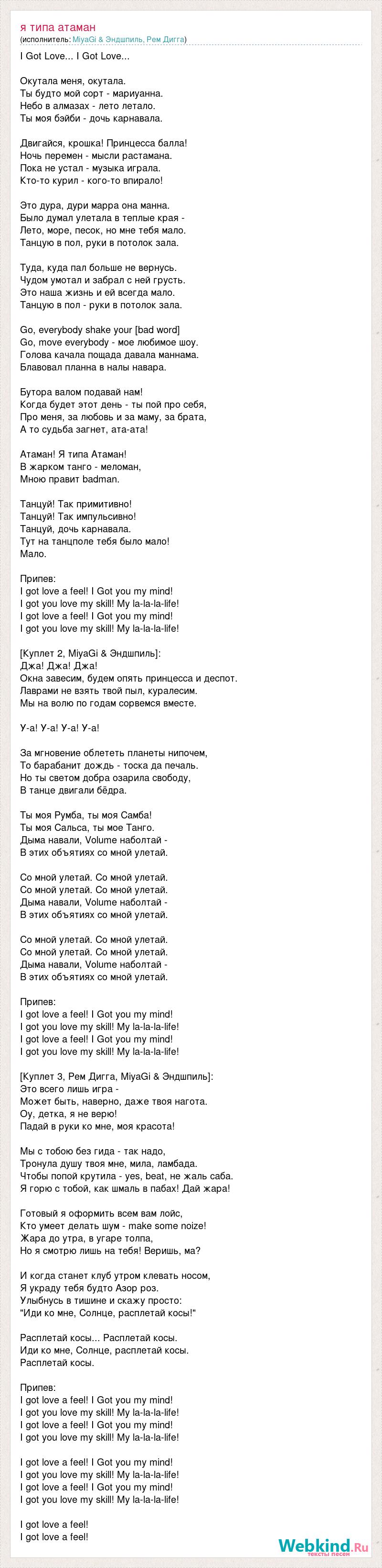 I Got Love... I Got Love... Окутала меня, окутала. Ты будто мой сорт - мариуанна. Небо в алмазах - лето летало. Ты моя бэйби - дочь карнавала. Двигайся, крошка! Принцесса балла! Ночь перемен - мысли растамана. Пока не устал - музыка играла. Кто-то курил - кого-то впирало! Это дура, дури марра она манна. Было думал улетала в теплые края - Лето, море, песок, но мне тебя мало. Танцую в пол, руки в потолок зала. Туда, куда пал больше не вернусь. Чудом умотал и забрал с ней грусть. Это наша жизнь и ей всегда мало. Танцую в пол - руки в потолок зала. Go, everybody shake your [bad word] Go, move everybody - мое любимое шоу. Голова качала пощада давала маннама. Блавовал планна в налы навара. Бутора валом подавай нам! Когда будет этот день - ты пой про себя, Про меня, за любовь и за маму, за брата, А то судьба загнет, ата-ата! Атаман! Я типа Атаман! В жарком танго - меломан, Мною правит badman. Танцуй! Так примитивно! Танцуй! Так импульсивно! Танцуй, дочь карнавала. Тут на танцполе тебя было мало! Мало. Припев: I got love a feel! I Got you my mind! I got you love my skill! My la-la-la-life! I got love a feel! I Got you my mind! I got you love my skill! My la-la-la-life! [Куплет 2, MiyaGi & Эндшпиль]: Джа! Джа! Джа! Окна завесим, будем опять принцесса и деспот. Лаврами не взять твой пыл, куралесим. Мы на волю по годам сорвемся вместе. У-а! У-а! У-а! У-а! За мгновение облететь планеты нипочем, То барабанит дождь - тоска да печаль. Но ты светом добра озарила свободу, В танце двигали бёдра. Ты моя Румба, ты моя Самба! Ты моя Сальса, ты мое Танго. Дыма навали, Volume наболтай - В этих объятиях со мной улетай. Со мной улетай. Со мной улетай. Со мной улетай. Со мной улетай. Дыма навали, Volume наболтай - В этих объятиях со мной улетай. Со мной улетай. Со мной улетай. Со мной улетай. Со мной улетай. Дыма навали, Volume наболтай - В этих объятиях со мной улетай. Припев: I got love a feel! I Got you my mind! I got you love my skill! My la-la-la-life! I got love a feel! I Got you my mind! I got you love my skill! My la-la-la-life! [Куплет 3, Рем Дигга, MiyaGi & Эндшпиль]: Это всего лишь игра - Может быть, наверно, даже твоя нагота. Оу, детка, я не верю! Падай в руки ко мне, моя красота! Мы с тобою без гида - так надо, Тронула душу твоя мне, мила, ламбада. Чтобы попой крутила - yes, beat, не жаль саба. Я горю с тобой, как шмаль в пабах! Дай жара! Готовый я оформить всем вам лойс, Кто умеет делать шум - make some noize! Жара до утра, в угаре толпа, Но я смотрю лишь на тебя! Веришь, ма? И когда станет клуб утром клевать носом, Я украду тебя будто Азор роз. Улыбнусь в тишине и скажу просто: "Иди ко мне, Солнце, расплетай косы!" Расплетай косы... Расплетай косы. Иди ко мне, Солнце, расплетай косы. Расплетай косы. Припев: I got love a feel! I Got you my mind! I got you love my skill! My la-la-la-life! I got love a feel! I Got you my mind! I got you love my skill! My la-la-la-life! I got love a feel! I Got you my mind! I got you love my skill! My la-la-la-life! I got love a feel! I Got you my mind! I got you love my skill! My la-la-la-life! I got love a feel! I got love a feel!