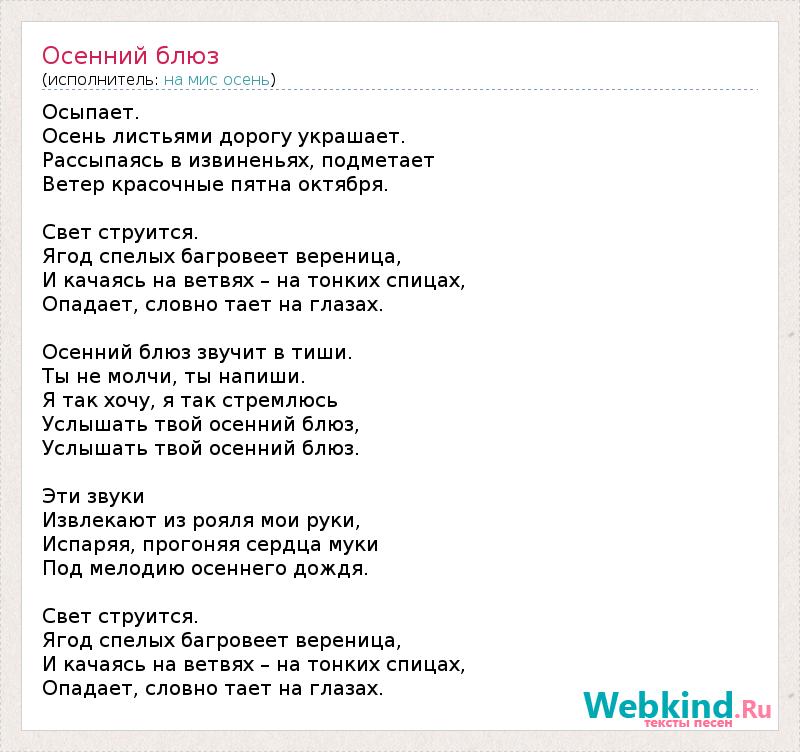 Осыпает. Осень листьями дорогу украшает. Рассыпаясь в извиненьях, подметает Ветер красочные пятна октября. Свет струится. Ягод спелых багровеет вереница, И качаясь на ветвях – на тонких спицах, Опадает, словно тает на глазах. Осенний блюз звучит в тиши. Ты не молчи, ты напиши. Я так хочу, я так стремлюсь Услышать твой осенний блюз, Услышать твой осенний блюз. Эти звуки Извлекают из рояля мои руки, Испаряя, прогоняя сердца муки Под мелодию осеннего дождя. Свет струится. Ягод спелых багровеет вереница, И качаясь на ветвях – на тонких спицах, Опадает, словно тает на глазах.
