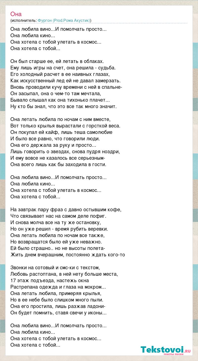 Она любила вино...И помолчать просто... Она любила кино... Она хотела с тобой улетать в космос... Она хотела с тобой... Он был старше ее, ей летать в облаках. Ему лишь игры на счет, она решила - судьба. Его холодный расчет в ее наивных глазах, Как искусственный лед ей не давал замерзать. Вновь проводили кучу времени с ней в спальне- Он засыпал, она о чем-то там мечтала, Бывало слышал как она тихонько плачет... Ну кто бы знал, что это все так много значит. Она летать любила по ночам с ним вместе, Вот только крылья вырастали с горсткой веса. Он покупал ей кайф, лишь теша самолюбие И было все равно, что говорили люди. Она его держала за руку и просто... Лишь говорить о звездах, снова пудря ноздри, И ему вовсе не казалось все серьезным- Она всего лишь как бы заходила в гости. Она любила вино...И помолчать просто... Она любила кино... Она хотела с тобой улетать в космос... Она хотела с тобой... На завтрак пару фраз с давно остывшим кофе, Что связывает нас на самом деле пофиг. И снова молча все на ту же остановку, Но он уже решил - время рубить веревки. Она летать любила по ночам все также, Но возвращатся было ей уже неважно. Ей было страшно.. но не высоты полета- Жить днем вчерашним, постоянно ждать кого-то Звонки на сотовый и смс-ки с текстом, Любовь растоптана, в ней нету больше места, 17 этаж подъезда, настежь окна Растрепана одежда и глаза на мокром... Она летать любила, примеряя крылья, Но в ее небе было слишком много пыли. Она его простила, лишь разжав ладони- Он будет помнить, ставя свечи у иконы... Она любила вино...И помолчать просто... Она любила кино... Она хотела с тобой улетать в космос... Она хотела с тобой...