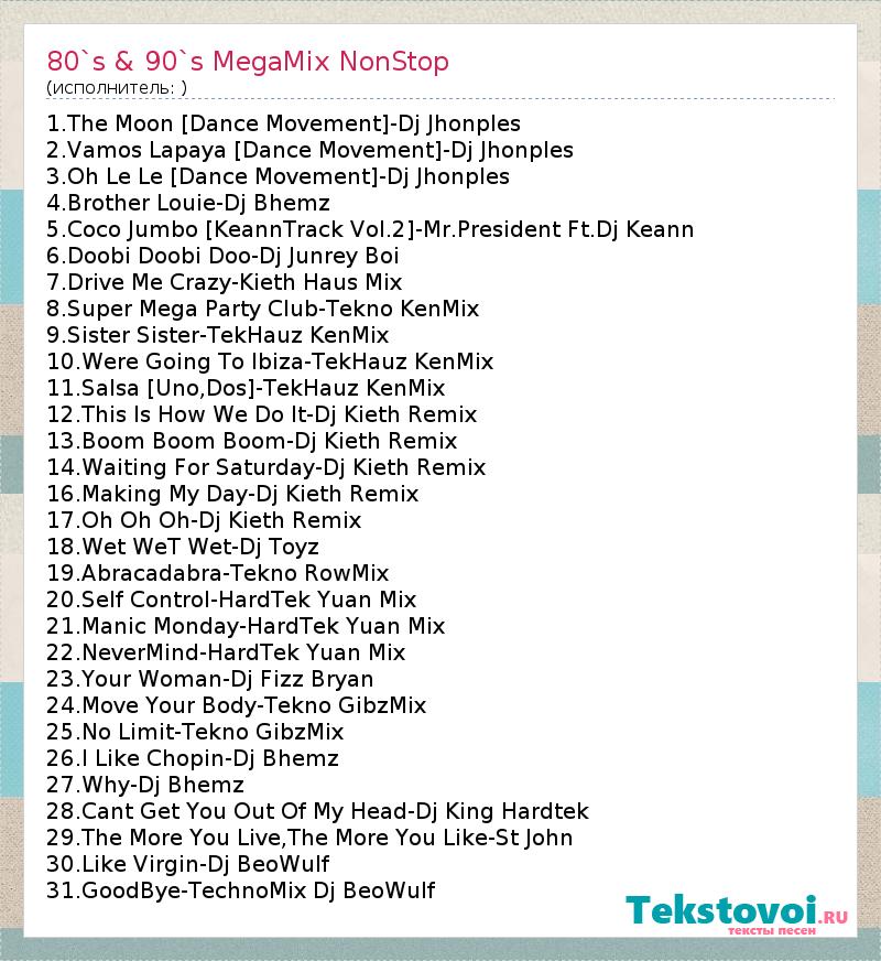1.The Moon [Dance Movement]-Dj Jhonples 2.Vamos Lapaya [Dance Movement]-Dj Jhonples 3.Oh Le Le [Dance Movement]-Dj Jhonples 4.Brother Louie-Dj Bhemz 5.Coco Jumbo [KeannTrack Vol.2]-Mr.President Ft.Dj Keann 6.Doobi Doobi Doo-Dj Junrey Boi 7.Drive Me Crazy-Kieth Haus Mix 8.Super Mega Party Club-Tekno KenMix 9.Sister Sister-TekHauz KenMix 10.Were Going To Ibiza-TekHauz KenMix 11.Salsa [Uno,Dos]-TekHauz KenMix 12.This Is How We Do It-Dj Kieth Remix 13.Boom Boom Boom-Dj Kieth Remix 14.Waiting For Saturday-Dj Kieth Remix 16.Making My Day-Dj Kieth Remix 17.Oh Oh Oh-Dj Kieth Remix 18.Wet WeT Wet-Dj Toyz 19.Abracadabra-Tekno RowMix 20.Self Control-HardTek Yuan Mix 21.Manic Monday-HardTek Yuan Mix 22.NeverMind-HardTek Yuan Mix 23.Your Woman-Dj Fizz Bryan 24.Move Your Body-Tekno GibzMix 25.No Limit-Tekno GibzMix 26.I Like Chopin-Dj Bhemz 27.Why-Dj Bhemz 28.Cant Get You Out Of My Head-Dj King Hardtek 29.The More You Live,The More You Like-St John 30.Like Virgin-Dj BeoWulf 31.GoodBye-TechnoMix Dj BeoWulf