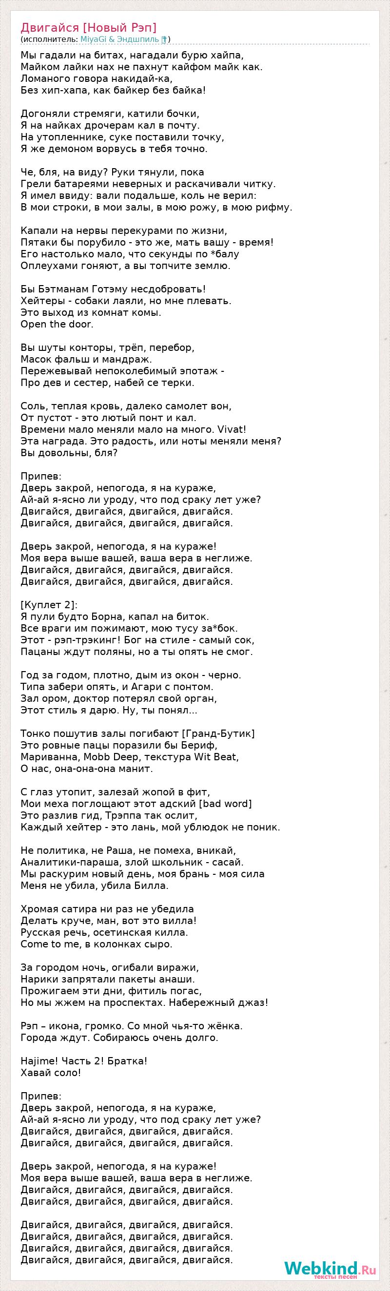 Мы гадали на битах, нагадали бурю хайпа, Майком лайки нах не пахнут кайфом майк как. Ломаного говора накидай-ка, Без хип-хапа, как байкер без байка! Догоняли стремяги, катили бочки, Я на найках дрочерам кал в почту. На утопленнике, суке поставили точку, Я же демоном ворвусь в тебя точно. Че, бля, на виду? Руки тянули, пока Грели батареями неверных и раскачивали читку. Я имел ввиду: вали подальше, коль не верил: В мои строки, в мои залы, в мою рожу, в мою рифму. Капали на нервы перекурами по жизни, Пятаки бы порубило - это же, мать вашу - время! Его настолько мало, что секунды по *балу Оплеухами гоняют, а вы топчите землю. Бы Бэтманам Готэму несдобровать! Хейтеры - собаки лаяли, но мне плевать. Это выход из комнат комы. Open the door. Вы шуты конторы, трёп, перебор, Масок фальш и мандраж. Пережевывай непоколебимый эпотаж - Про дев и сестер, набей се терки. Соль, теплая кровь, далеко самолет вон, От пустот - это лютый понт и кал. Времени мало меняли мало на много. Vivat! Эта награда. Это радость, или ноты меняли меня? Вы довольны, бля? Припев: Дверь закрой, непогода, я на кураже, Ай-ай я-ясно ли уроду, что под сраку лет уже? Двигайся, двигайся, двигайся, двигайся. Двигайся, двигайся, двигайся, двигайся. Дверь закрой, непогода, я на кураже! Моя вера выше вашей, ваша вера в неглиже. Двигайся, двигайся, двигайся, двигайся. Двигайся, двигайся, двигайся, двигайся. [Куплет 2]: Я пули будто Борна, капал на биток. Все враги им пожимают, мою тусу за*бок. Этот - рэп-трэкинг! Бог на стиле - самый сок, Пацаны ждут поляны, но а ты опять не смог. Год за годом, плотно, дым из окон - черно. Типа забери опять, и Агари с понтом. Зал ором, доктор потерял свой орган, Этот стиль я дарю. Ну, ты понял... Тонко пошутив залы погибают [Гранд-Бутик] Это ровные пацы поразили бы Бериф, Мариванна, Mobb Deep, текстура Wit Beat, О нас, она-она-она манит. С глаз утопит, залезай жопой в фит, Мои меха поглощают этот адский [bad word] Это разлив гид, Трэппа так ослит, Каждый хейтер - это лань, мой ублюдок не поник. Не политика, не Раша, не помеха, вникай, Аналитики-параша, злой школьник - сасай. Мы раскурим новый день, моя брань - моя сила Меня не убила, убила Билла. Хромая сатира ни раз не убедила Делать круче, ман, вот это вилла! Русская речь, осетинская килла. Come to me, в колонках сыро. За городом ночь, огибали виражи, Нарики запрятали пакеты анаши. Прожигаем эти дни, фитиль погас, Но мы жжем на проспектах. Набережный джаз! Рэп – икона, громко. Со мной чья-то жёнка. Города ждут. Собираюсь очень долго. Hajime! Часть 2! Братка! Хавай соло! Припев: Дверь закрой, непогода, я на кураже, Ай-ай я-ясно ли уроду, что под сраку лет уже? Двигайся, двигайся, двигайся, двигайся. Двигайся, двигайся, двигайся, двигайся. Дверь закрой, непогода, я на кураже! Моя вера выше вашей, ваша вера в неглиже. Двигайся, двигайся, двигайся, двигайся. Двигайся, двигайся, двигайся, двигайся. Двигайся, двигайся, двигайся, двигайся. Двигайся, двигайся, двигайся, двигайся. Двигайся, двигайся, двигайся, двигайся. Двигайся, двигайся, двигайся, двигайся.
