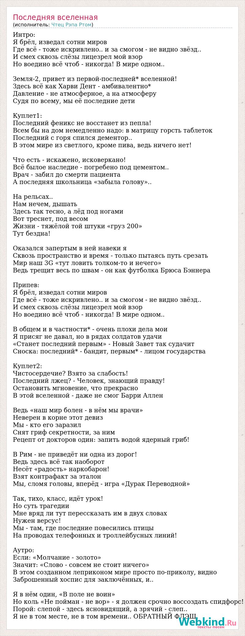 Интро: Я брёл, изведал сотни миров Где всё - тоже искривлено.. и за смогом - не видно звёзд.. И смех сквозь слёзы лицезрел мой взор Но воедино всё чтоб - никогда! В мире одном.. Земля-2, привет из первой-последней* вселенной! Здесь всё как Харви Дент - амбивалентно* Давление - не атмосферное, а на атмосферу Судя по всему, мы её последние дети Куплет1: Последний феникс не восстанет из пепла! Всем бы на дом немедленно надо: в матрицу горсть таблеток Последний с горя спился дементор.. В этом мире из светлого, кроме пива, ведь ничего нет! Что есть - искажено, исковеркано! Всё былое наследие - погребено под цементом.. Врач - забил до смерти пациента А последняя школьница «забыла голову».. На рельсах.. Нам нечем, дышать Здесь так тесно, а лёд под ногами Вот треснет, под весом Жизни - тяжёлой той штуки «груз 200» Тут бездна! Оказался запертым в ней навеки я Сквозь пространство и время - только пытаясь путь срезать Мир наш 3G «тут ловить толком-то и нечего» Ведь трещит весь по швам - он как футболка Брюса Бэннера Припев: Я брёл, изведал сотни миров Где всё - тоже искривлено.. и за смогом - не видно звёзд.. И смех сквозь слёзы лицезрел мой взор Но воедино всё чтоб - никогда! В мире одном.. В общем и в частности* - очень плохи дела мои Я присяг не давал, но в рядах солдатов удачи «Станет последний первым» - Новый Завет так судачит Сноска: последний* - бандит, первым* - лицом государства Куплет2: Чистосердечие? Взято за слабость! Последний лжец? - Человек, знающий правду! Остановить мгновение, что прекрасно В этой вселенной - даже не смог Барри Аллен Ведь «наш мир болен - в нём мы врачи» Неверен в корне этот девиз Мы - кто его заразил Снят гриф секретности, за ним Рецепт от докторов один: запить водой ядерный гриб! В Рим - не приведёт ни одна из дорог! Ведь здесь всё так наоборот Несёт «радость» наркобарон! Взят контрафакт за эталон Мы, сломя головы, вперёд - игра «Дурак Переводной» Так, тихо, класс, идёт урок! Но суть трагедии Мне вряд ли тут перессказать им в двух словах Нужен версус! Мы - там, где последние повесились птицы На проводах телефонных и троллейбусных линий! Аутро: Если: «Молчание - золото» Значит: «Слово - совсем не стоит ничего» В этом созданном леприконом мире просто по-приколу, видно Заброшенный хоспис для заключённых, и.. Я в нём один, «В поле не воин» Но коль «Не пойман - не вор» - я должен срочно воссоздать спидфорс! Порой: слепой - здесь ясновидящий, а зрячий - слеп.. Я не в том месте, не в том времени.. ОБРАТНЫЙ ФЛЭШ.