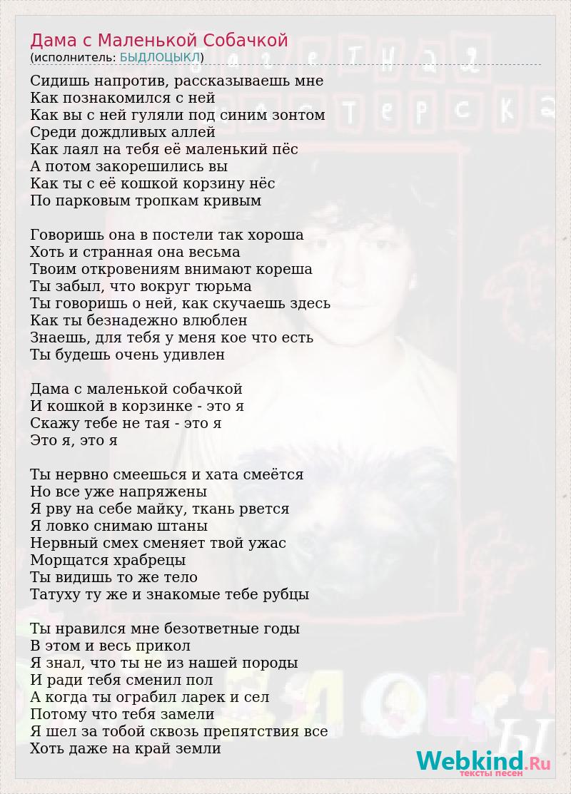 Сидишь напротив, рассказываешь мне Как познакомился с ней Как вы с ней гуляли под синим зонтом Среди дождливых аллей Как лаял на тебя её маленький пёс А потом закорешились вы Как ты с её кошкой корзину нёс По парковым тропкам кривым Говоришь она в постели так хороша Хоть и странная она весьма Твоим откровениям внимают кореша Ты забыл, что вокруг тюрьма Ты говоришь о ней, как скучаешь здесь Как ты безнадежно влюблен Знаешь, для тебя у меня кое что есть Ты будешь очень удивлен Дама с маленькой собачкой И кошкой в корзинке - это я Скажу тебе не тая - это я Это я, это я Ты нервно смеешься и хата смеётся Но все уже напряжены Я рву на себе майку, ткань рвется Я ловко снимаю штаны Нервный смех сменяет твой ужас Морщатся храбрецы Ты видишь то же тело Татуху ту же и знакомые тебе рубцы Ты нравился мне безответные годы В этом и весь прикол Я знал, что ты не из нашей породы И ради тебя сменил пол А когда ты ограбил ларек и сел Потому что тебя замели Я шел за тобой сквозь препятствия все Хоть даже на край земли