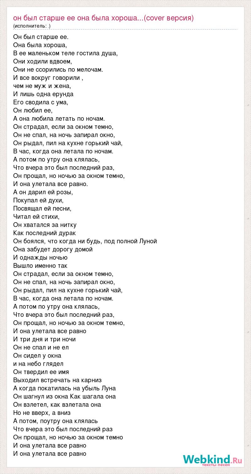 Он был старше ее. Она была хороша, В ее маленьком теле гостила душа, Они ходили вдвоем, Они не ссорились по мелочам. И все вокруг говорили , чем не муж и жена, И лишь одна ерунда Его сводила с ума, Он любил ее, А она любила летать по ночам. Он страдал, если за окном темно, Он не спал, на ночь запирал окно, Он рыдал, пил на кухне горький чай, В час, когда она летала по ночам. А потом по утру она клялась, Что вчера это был последний раз, Он прощал, но ночью за окном темно, И она улетала все равно. А он дарил ей розы, Покупал ей духи, Посвящал ей песни, Читал ей стихи, Он хватался за нитку Как последний дурак Он боялся, что когда ни будь, под полной Луной Она забудет дорогу домой И однажды ночью Вышло именно так Он страдал, если за окном темно, Он не спал, на ночь запирал окно, Он рыдал, пил на кухне горький чай, В час, когда она летала по ночам. А потом по утру она клялась, Что вчера это был последний раз, Он прощал, но ночью за окном темно, И она улетала все равно И три дня и три ночи Он не спал и не ел Он сидел у окна и на небо глядел Он твердил ее имя Выходил встречать на карниз А когда покатилась на убыль Луна Он шагнул из окна Как шагала она Он взлетел, как взлетала она Но не вверх, а вниз А потом, поутру она клялась Что вчера это был последний раз Он прощал, но ночью за окном темно И она улетала все равно И она улетала все равно
