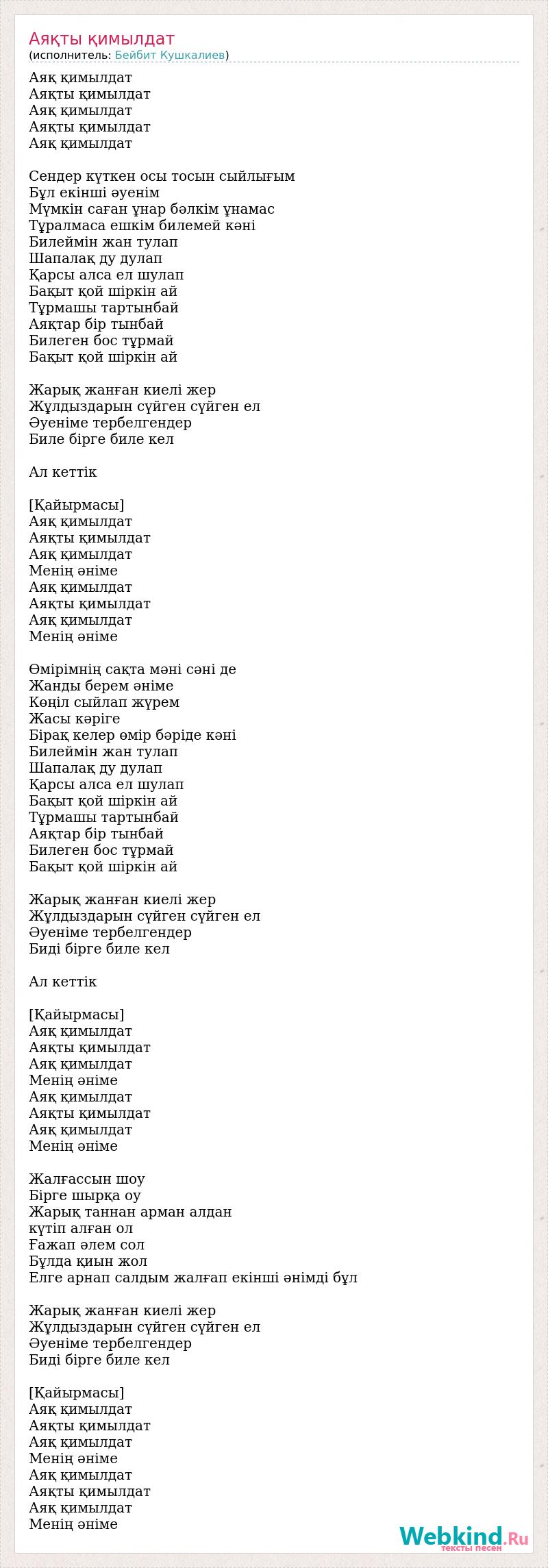 Аяқ қимылдат Аяқты қимылдат Аяқ қимылдат Аяқты қимылдат Аяқ қимылдат Сендер күткен осы тосын сыйлығым Бұл екінші әуенім Мүмкін саған ұнар бәлкім ұнамас Тұралмаса ешкім билемей кәні Билеймін жан тулап Шапалақ ду дулап Қарсы алса ел шулап Бақыт қой шіркін ай Тұрмашы тартынбай Аяқтар бір тынбай Билеген бос тұрмай Бақыт қой шіркін ай Жарық жанған киелі жер Жұлдыздарын сүйген сүйген ел Әуеніме тербелгендер Биле бірге биле кел Ал кеттік [Қайырмасы] Аяқ қимылдат Аяқты қимылдат Аяқ қимылдат Менің әніме Аяқ қимылдат Аяқты қимылдат Аяқ қимылдат Менің әніме Өмірімнің сақта мәні сәні де Жанды берем әніме Көңіл сыйлап жүрем Жасы кәріге Бірақ келер өмір бәріде кәні Билеймін жан тулап Шапалақ ду дулап Қарсы алса ел шулап Бақыт қой шіркін ай Тұрмашы тартынбай Аяқтар бір тынбай Билеген бос тұрмай Бақыт қой шіркін ай Жарық жанған киелі жер Жұлдыздарын сүйген сүйген ел Әуеніме тербелгендер Биді бірге биле кел Ал кеттік [Қайырмасы] Аяқ қимылдат Аяқты қимылдат Аяқ қимылдат Менің әніме Аяқ қимылдат Аяқты қимылдат Аяқ қимылдат Менің әніме Жалғассын шоу Бірге шырқа оу Жарық таннан арман алдан күтіп алған ол Ғажап әлем сол Бұлда қиын жол Елге арнап салдым жалғап екінші әнімді бұл Жарық жанған киелі жер Жұлдыздарын сүйген сүйген ел Әуеніме тербелгендер Биді бірге биле кел [Қайырмасы] Аяқ қимылдат Аяқты қимылдат Аяқ қимылдат Менің әніме Аяқ қимылдат Аяқты қимылдат Аяқ қимылдат Менің әніме