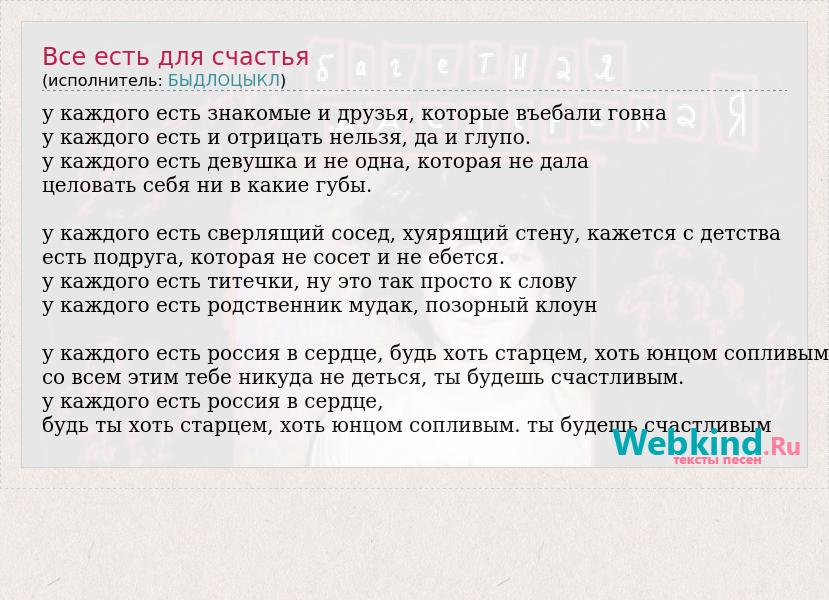 у каждого есть знакомые и друзья, которые въебали говна у каждого есть и отрицать нельзя, да и глупо. у каждого есть девушка и не одна, которая не дала целовать себя ни в какие губы. у каждого есть сверлящий сосед, хуярящий стену, кажется с детства есть подруга, которая не сосет и не ебется. у каждого есть титечки, ну это так просто к слову у каждого есть родственник мудак, позорный клоун у каждого есть россия в сердце, будь хоть старцем, хоть юнцом сопливым со всем этим тебе никуда не деться, ты будешь счастливым. у каждого есть россия в сердце, будь ты хоть старцем, хоть юнцом сопливым. ты будешь счастливым