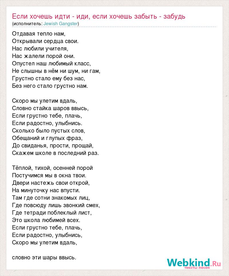 Отдавая тепло нам, Открывали сердца свои. Нас любили учителя, Нас жалели порой они. Опустел наш любимый класс, Не слышны в нём ни шум, ни гам, Грустно стало ему без нас, Без него стало грустно нам. Скоро мы улетим вдаль, Словно стайка шаров ввысь, Если грустно тебе, плачь, Если радостно, улыбнись. Сколько было пустых слов, Обещаний и глупых фраз, До свиданья, прости, прощай, Скажем школе в последний раз. Тёплой, тихой, осенней порой Постучимся мы в окна твои. Двери настежь свои открой, На минуточку нас впусти. Там где сотни знакомых лиц, Где повсюду лишь звонкий смех, Где тетради поблеклый лист, Это школа любимей всех. Если грустно тебе, плачь, Если радостно, улыбнись, Скоро мы улетим вдаль, словно эти шары ввысь.