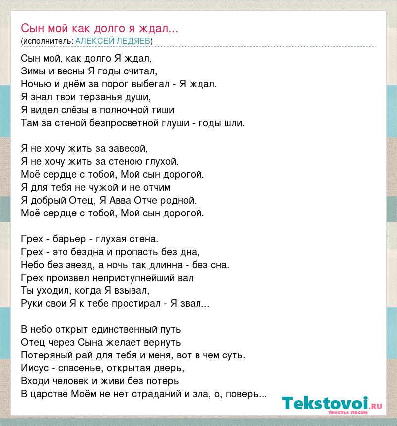 Сын мой, как долго Я ждал, Зимы и весны Я годы считал, Ночью и днём за порог выбегал - Я ждал. Я знал твои терзанья души, Я видел слёзы в полночной тиши Там за стеной безпросветной глуши - годы шли. Я не хочу жить за завесой, Я не хочу жить за стеною глухой. Моё сердце с тобой, Мой сын дорогой. Я для тебя не чужой и не отчим Я добрый Отец, Я Авва Отче родной. Моё сердце с тобой, Мой сын дорогой. Грех - барьер - глухая стена. Грех - это бездна и пропасть без дна, Небо без звезд, а ночь так длинна - без сна. Грех произвел неприступнейший вал Ты уходил, когда Я взывал, Руки свои Я к тебе простирал - Я звал... В небо открыт единственный путь Отец через Сына желает вернуть Потеряный рай для тебя и меня, вот в чем суть. Иисус - спасенье, открытая дверь, Входи человек и живи без потерь В царстве Моём не нет страданий и зла, о, поверь...