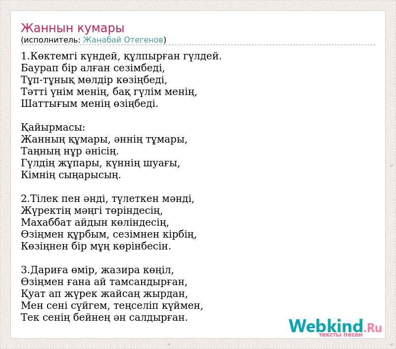 1.Көктемгі күндей, құлпырған гүлдей. Баурап бір алған сезімбеді, Тұп-тұнық мөлдір көзіңбеді, Тәтті үнім менің, бақ гүлім менің, Шаттығым менің өзіңбеді. Қайырмасы: Жанның құмары, әннің тұмары, Таңның нұр әнісің. Гүлдің жұпары, күннің шуағы, Кімнің сыңарысың. 2.Тілек пен әнді, түлеткен мәнді, Жүректің мәңгі төріндесің, Махаббат айдын көліндесің, Өзіңмен құрбым, сезімнен кірбің, Көзіңнен бір мұң көрінбесін. 3.Дариға өмір, жазира көңіл, Өзіңмен ғана ай тамсандырған, Қуат ап жүрек жайсаң жырдан, Мен сені сүйгем, теңселіп күймен, Тек сенің бейнең ән салдырған.