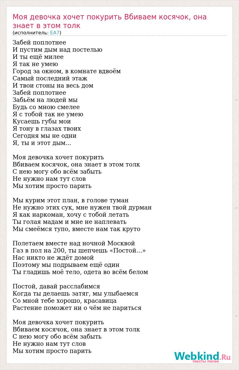Забей поплотнее И пустим дым над постелью И ты ещё милее Я так не умею Город за окном, в комнате вдвоём Самый последний этаж И твои стоны на весь дом Забей поплотнее Забьём на людей мы Будь со мною смелее Я с тобой так не умею Кусаешь губы мои Я тону в глазах твоих Сегодня мы не одни Я, ты и этот дым... Моя девочка хочет покурить Вбиваем косячок, она знает в этом толк С нею могу обо всём забыть Не нужно нам тут слов Мы хотим просто парить Мы курим этот план, в голове туман Не нужно этих сук, мне нужен твой дурман Я как наркоман, хочу с тобой летать Ты голая мадам и мне не наплевать Мы смеёмся тупо, вместе нам так круто Полетаем вместе над ночной Москвой Газ в пол на 200, ты шепчешь «Постой…» Нас никто не ждёт домой Поэтому мы подрываем ещё один Ты гладишь моё тело, одета во всём белом Постой, давай расслабимся Когда ты делаешь затяг, мы улыбаемся Со мной тебе хорошо, красавица Растение поможет ни о чём не париться Моя девочка хочет покурить Вбиваем косячок, она знает в этом толк С нею могу обо всём забыть Не нужно нам тут слов Мы хотим просто парить