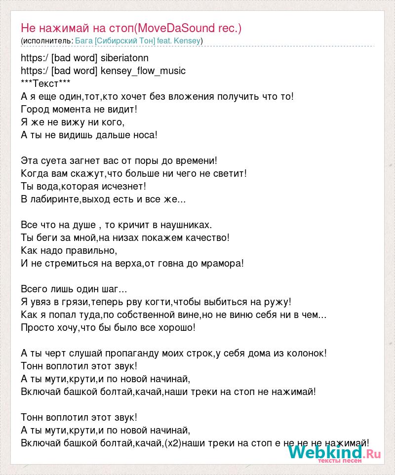 https:/ [bad word] siberiatonn https:/ [bad word] kensey_flow_music ***Текст*** А я еще один,тот,кто хочет без вложения получить что то! Город момента не видит! Я же не вижу ни кого, А ты не видишь дальше носа! Эта суета загнет вас от поры до времени! Когда вам скажут,что больше ни чего не светит! Ты вода,которая исчезнет! В лабиринте,выход есть и все же... Все что на душе , то кричит в наушниках. Ты беги за мной,на низах покажем качество! Как надо правильно, И не стремиться на верха,от говна до мрамора! Всего лишь один шаг... Я увяз в грязи,теперь рву когти,чтобы выбиться на ружу! Как я попал туда,по собственной вине,но не виню себя ни в чем... Просто хочу,что бы было все хорошо! А ты черт слушай пропаганду моих строк,у себя дома из колонок! Тонн воплотил этот звук! А ты мути,крути,и по новой начинай, Включай башкой болтай,качай,наши треки на стоп не нажимай! Тонн воплотил этот звук! А ты мути,крути,и по новой начинай, Включай башкой болтай,качай,(х2)наши треки на стоп е не не не нажимай!