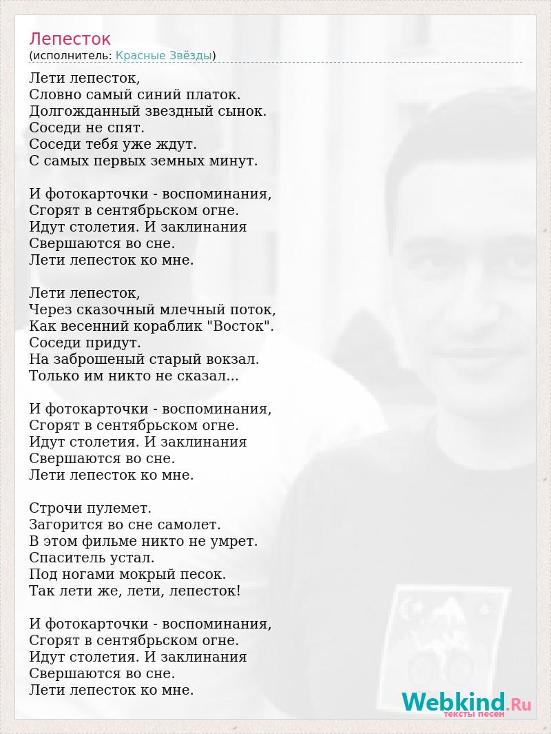 Лети лепесток, Словно самый синий платок. Долгожданный звездный сынок. Соседи не спят. Соседи тебя уже ждут. С самых первых земных минут. И фотокарточки - воспоминания, Сгорят в сентябрьском огне. Идут столетия. И заклинания Свершаются во сне. Лети лепесток ко мне. Лети лепесток, Через сказочный млечный поток, Как весенний кораблик "Восток". Соседи придут. На заброшеный старый вокзал. Только им никто не сказал... И фотокарточки - воспоминания, Сгорят в сентябрьском огне. Идут столетия. И заклинания Свершаются во сне. Лети лепесток ко мне. Строчи пулемет. Загорится во сне самолет. В этом фильме никто не умрет. Спаситель устал. Под ногами мокрый песок. Так лети же, лети, лепесток! И фотокарточки - воспоминания, Сгорят в сентябрьском огне. Идут столетия. И заклинания Свершаются во сне. Лети лепесток ко мне.