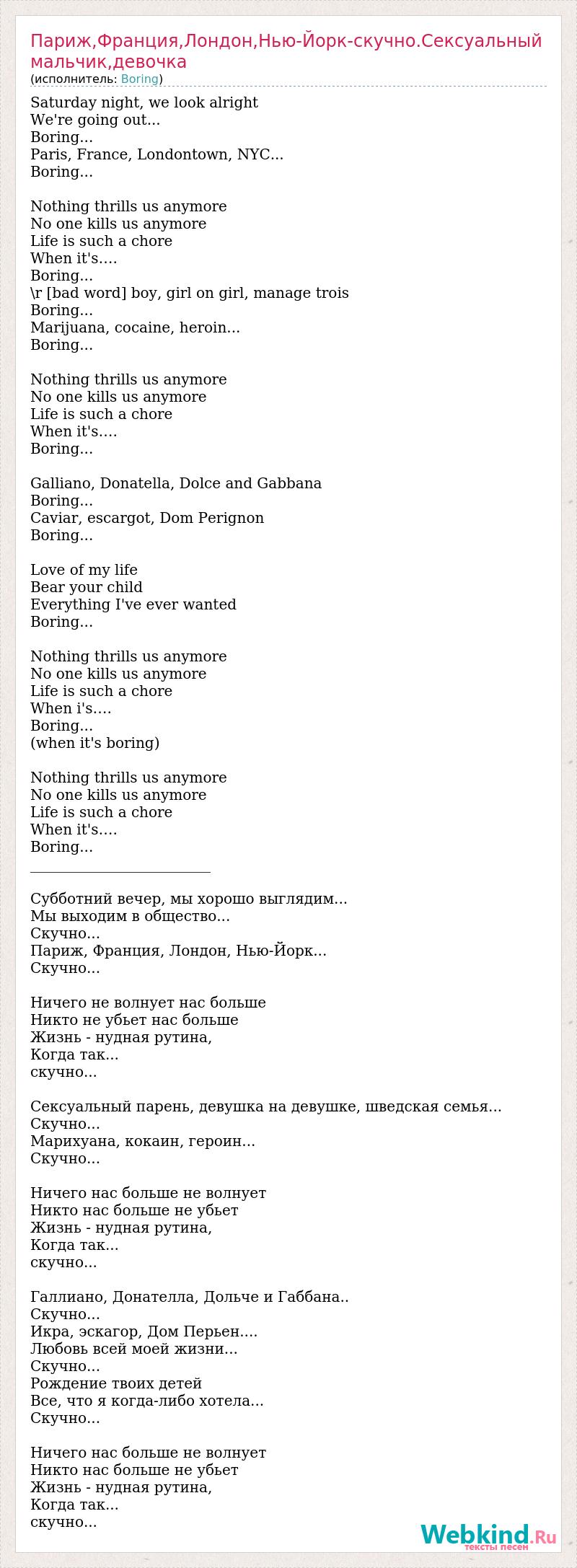 Saturday night, we look alright We're going out... Boring... Paris, France, Londontown, NYC... Boring... Nothing thrills us anymore No one kills us anymore Life is such a chore When it's…. Boring... \r [bad word] boy, girl on girl, manage trois Boring... Marijuana, cocaine, heroin... Boring... Nothing thrills us anymore No one kills us anymore Life is such a chore When it's…. Boring... Galliano, Donatella, Dolce and Gabbana Boring... Caviar, escargot, Dom Perignon Boring... Love of my life Bear your child Everything I've ever wanted Boring... Nothing thrills us anymore No one kills us anymore Life is such a chore When i's…. Boring... (when it's boring) Nothing thrills us anymore No one kills us anymore Life is such a chore When it's…. Boring... _________________________ Субботний вечер, мы хорошо выглядим... Мы выходим в общество... Скучно... Париж, Франция, Лондон, Нью-Йорк... Скучно... Ничего не волнует нас больше Никто не убьет нас больше Жизнь - нудная рутина, Когда так... скучно... Сексуальный парень, девушка на девушке, шведская семья... Скучно... Марихуана, кокаин, героин... Скучно... Ничего нас больше не волнует Никто нас больше не убьет Жизнь - нудная рутина, Когда так... скучно... Галлиано, Донателла, Дольче и Габбана.. Скучно... Икра, эскагор, Дом Перьен.... Любовь всей моей жизни... Скучно... Рождение твоих детей Все, что я когда-либо хотела... Скучно... Ничего нас больше не волнует Никто нас больше не убьет Жизнь - нудная рутина, Когда так... скучно...
