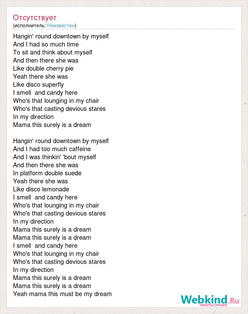 Hangin' round downtown by myself And I had so much time To sit and think about myself And then there she was Like double cherry pie Yeah there she was Like disco superfly I smell and candy here Who's that lounging in my chair Who's that casting devious stares In my direction Mama this surely is a dream Hangin' round downtown by myself And I had too much caffeine And I was thinkin' 'bout myself And then there she was In platform double suede Yeah there she was Like disco lemonade I smell and candy here Who's that lounging in my chair Who's that casting devious stares In my direction Mama this surely is a dream Mama this surely is a dream I smell and candy here Who's that lounging in my chair Who's that casting devious stares In my direction Mama this surely is a dream Mama this surely is a dream Yeah mama this must be my dream