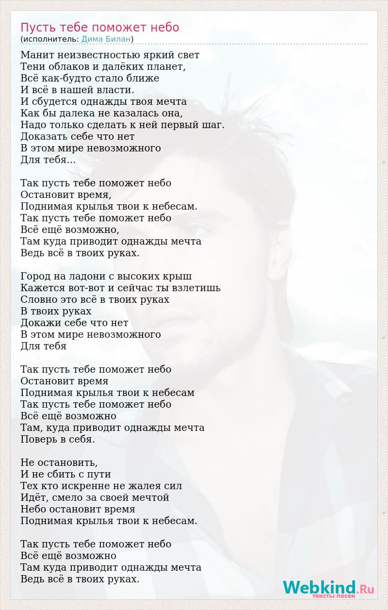 Манит неизвестностью яркий свет Тени облаков и далёких планет, Всё как-будто стало ближе И всё в нашей власти. И сбудется однажды твоя мечта Как бы далека не казалась она, Надо только сделать к ней первый шаг. Доказать себе что нет В этом мире невозможного Для тебя... Так пусть тебе поможет небо Остановит время, Поднимая крылья твои к небесам. Так пусть тебе поможет небо Всё ещё возможно, Там куда приводит однажды мечта Ведь всё в твоих руках. Город на ладони с высоких крыш Кажется вот-вот и сейчас ты взлетишь Словно это всё в твоих руках В твоих руках Докажи себе что нет В этом мире невозможного Для тебя Так пусть тебе поможет небо Остановит время Поднимая крылья твои к небесам Так пусть тебе поможет небо Всё ещё возможно Там, куда приводит однажды мечта Поверь в себя. Не остановить, И не сбить с пути Тех кто искренне не жалея сил Идёт, смело за своей мечтой Небо остановит время Поднимая крылья твои к небесам. Так пусть тебе поможет небо Всё ещё возможно Там куда приводит однажды мечта Ведь всё в твоих руках.