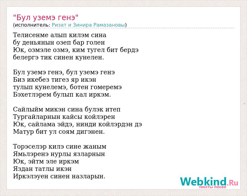 Телисенме алып килэм сина бу деньянын озеп бар голен Юк, озмэле озмэ, ким тугел бит бердэ белергэ тик синен кунелен. Бул уземэ генэ, бул уземэ генэ Биз икебез тигез яр икэн тулып кунелемэ, ботен гомеремэ Бэхетлэрем булып кал иркэм. Сайлыйм микэн сина булэк итеп Тургайларнын кайсы койлэрен Юк, сайлама эйдэ, нинди койлэрдэн дэ Матур бит ул соям дигэнен. Торэселэр килэ сине жаным Ямьлэренэ нурлы язларнын Юк, эйтм эле иркэм Яздан татлы икэн Иркэлэуен синен назларын.