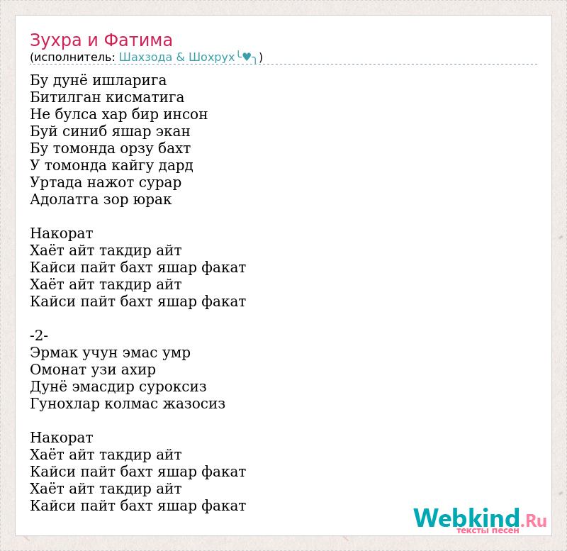 Бу дунё ишларига Битилган кисматига Не булса хар бир инсон Буй синиб яшар экан Бу томонда орзу бахт У томонда кайгу дард Уртада нажот сурар Адолатга зор юрак Накорат Хаёт айт такдир айт Кайси пайт бахт яшар факат Хаёт айт такдир айт Кайси пайт бахт яшар факат -2- Эрмак учун эмас умр Омонат узи ахир Дунё эмасдир суроксиз Гунохлар колмас жазосиз Накорат Хаёт айт такдир айт Кайси пайт бахт яшар факат Хаёт айт такдир айт Кайси пайт бахт яшар факат