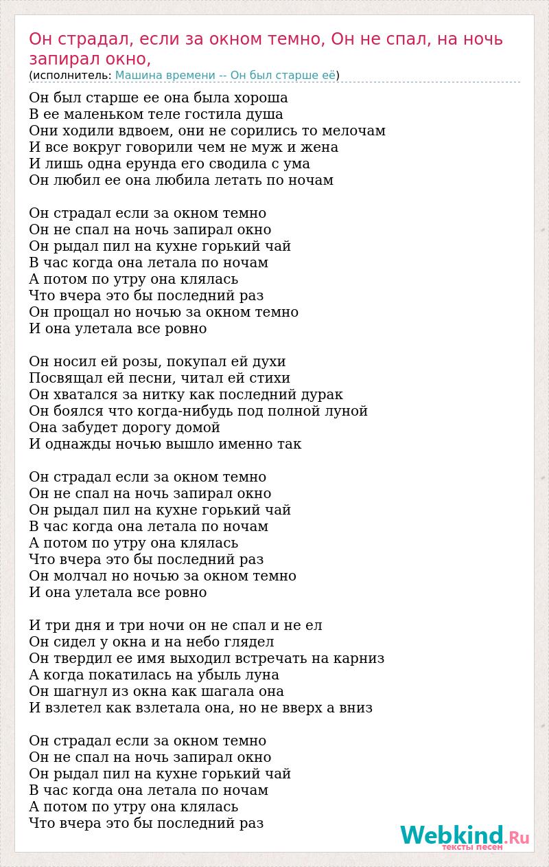 Главная→Исполнители→Машина времени -- Он был старше её→Он страдал, если за окном темно, Он не спал, на ночь запирал окно,