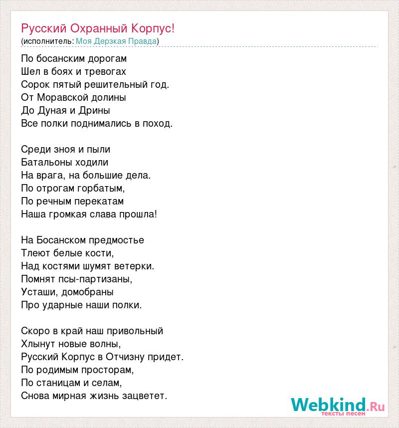 По босанским дорогам Шел в боях и тревогах Сорок пятый решительный год. От Моравской долины До Дуная и Дрины Все полки поднимались в поход. Среди зноя и пыли Батальоны ходили На врага, на большие дела. По отрогам горбатым, По речным перекатам Наша громкая слава прошла! На Босанском предмостье Тлеют белые кости, Над костями шумят ветерки. Помнят псы-партизаны, Усташи, домобраны Про ударные наши полки. Скоро в край наш привольный Хлынут новые волны, Русский Корпус в Отчизну придет. По родимым просторам, По станицам и селам, Снова мирная жизнь зацветет.