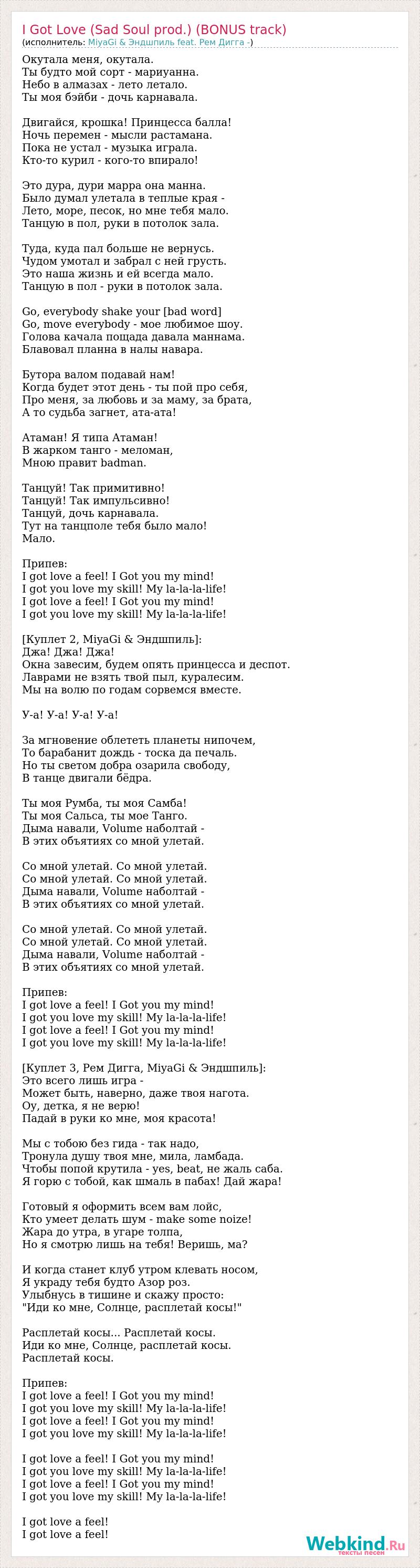 Окутала меня, окутала. Ты будто мой сорт - мариуанна. Небо в алмазах - лето летало. Ты моя бэйби - дочь карнавала. Двигайся, крошка! Принцесса балла! Ночь перемен - мысли растамана. Пока не устал - музыка играла. Кто-то курил - кого-то впирало! Это дура, дури марра она манна. Было думал улетала в теплые края - Лето, море, песок, но мне тебя мало. Танцую в пол, руки в потолок зала. Туда, куда пал больше не вернусь. Чудом умотал и забрал с ней грусть. Это наша жизнь и ей всегда мало. Танцую в пол - руки в потолок зала. Go, everybody shake your [bad word] Go, move everybody - мое любимое шоу. Голова качала пощада давала маннама. Блавовал планна в налы навара. Бутора валом подавай нам! Когда будет этот день - ты пой про себя, Про меня, за любовь и за маму, за брата, А то судьба загнет, ата-ата! Атаман! Я типа Атаман! В жарком танго - меломан, Мною правит badman. Танцуй! Так примитивно! Танцуй! Так импульсивно! Танцуй, дочь карнавала. Тут на танцполе тебя было мало! Мало. Припев: I got love a feel! I Got you my mind! I got you love my skill! My la-la-la-life! I got love a feel! I Got you my mind! I got you love my skill! My la-la-la-life! [Куплет 2, MiyaGi & Эндшпиль]: Джа! Джа! Джа! Окна завесим, будем опять принцесса и деспот. Лаврами не взять твой пыл, куралесим. Мы на волю по годам сорвемся вместе. У-а! У-а! У-а! У-а! За мгновение облететь планеты нипочем, То барабанит дождь - тоска да печаль. Но ты светом добра озарила свободу, В танце двигали бёдра. Ты моя Румба, ты моя Самба! Ты моя Сальса, ты мое Танго. Дыма навали, Volume наболтай - В этих объятиях со мной улетай. Со мной улетай. Со мной улетай. Со мной улетай. Со мной улетай. Дыма навали, Volume наболтай - В этих объятиях со мной улетай. Со мной улетай. Со мной улетай. Со мной улетай. Со мной улетай. Дыма навали, Volume наболтай - В этих объятиях со мной улетай. Припев: I got love a feel! I Got you my mind! I got you love my skill! My la-la-la-life! I got love a feel! I Got you my mind! I got you love my skill! My la-la-la-life! [Куплет 3, Рем Дигга, MiyaGi & Эндшпиль]: Это всего лишь игра - Может быть, наверно, даже твоя нагота. Оу, детка, я не верю! Падай в руки ко мне, моя красота! Мы с тобою без гида - так надо, Тронула душу твоя мне, мила, ламбада. Чтобы попой крутила - yes, beat, не жаль саба. Я горю с тобой, как шмаль в пабах! Дай жара! Готовый я оформить всем вам лойс, Кто умеет делать шум - make some noize! Жара до утра, в угаре толпа, Но я смотрю лишь на тебя! Веришь, ма? И когда станет клуб утром клевать носом, Я украду тебя будто Азор роз. Улыбнусь в тишине и скажу просто: "Иди ко мне, Солнце, расплетай косы!" Расплетай косы... Расплетай косы. Иди ко мне, Солнце, расплетай косы. Расплетай косы. Припев: I got love a feel! I Got you my mind! I got you love my skill! My la-la-la-life! I got love a feel! I Got you my mind! I got you love my skill! My la-la-la-life! I got love a feel! I Got you my mind! I got you love my skill! My la-la-la-life! I got love a feel! I Got you my mind! I got you love my skill! My la-la-la-life! I got love a feel! I got love a feel!