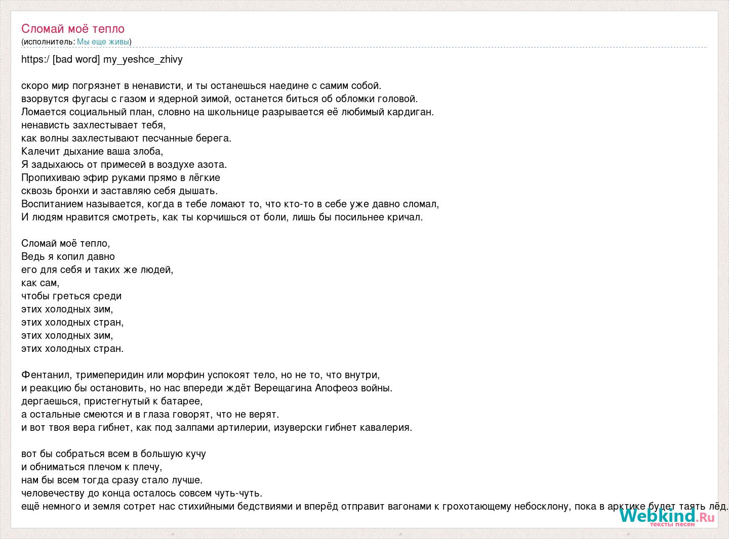 https:/ [bad word] my_yeshce_zhivy скоро мир погрязнет в ненависти, и ты останешься наедине с самим собой. взорвутся фугасы с газом и ядерной зимой, останется биться об обломки головой. Ломается социальный план, словно на школьнице разрывается её любимый кардиган. ненависть захлестывает тебя, как волны захлестывают песчанные берега. Калечит дыхание ваша злоба, Я задыхаюсь от примесей в воздухе азота. Пропихиваю эфир руками прямо в лёгкие сквозь бронхи и заставляю себя дышать. Воспитанием называется, когда в тебе ломают то, что кто-то в себе уже давно сломал, И людям нравится смотреть, как ты корчишься от боли, лишь бы посильнее кричал. Сломай моё тепло, Ведь я копил давно его для себя и таких же людей, как сам, чтобы греться среди этих холодных зим, этих холодных стран, этих холодных зим, этих холодных стран. Фентанил, тримеперидин или морфин успокоят тело, но не то, что внутри, и реакцию бы остановить, но нас впереди ждёт Верещагина Апофеоз войны. дергаешься, пристегнутый к батарее, а остальные смеются и в глаза говорят, что не верят. и вот твоя вера гибнет, как под залпами артилерии, изуверски гибнет кавалерия. вот бы собраться всем в большую кучу и обниматься плечом к плечу, нам бы всем тогда сразу стало лучше. человечеству до конца осталось совсем чуть-чуть. ещё немного и земля сотрет нас стихийными бедствиями и вперёд отправит вагонами к грохотающему небосклону, пока в арктике будет таять лёд.