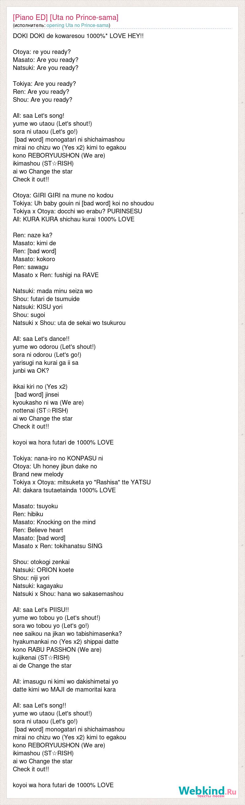 DOKI DOKI de kowaresou 1000%* LOVE HEY!! Otoya: re you ready? Masato: Are you ready? Natsuki: Are you ready? Tokiya: Are you ready? Ren: Are you ready? Shou: Are you ready? All: saa Let's song! yume wo utaou (Let's shout!) sora ni utaou (Let's go!) [bad word] monogatari ni shichaimashou mirai no chizu wo (Yes x2) kimi to egakou kono REBORYUUSHON (We are) ikimashou (ST☆RISH) ai wo Change the star Check it out!! Otoya: GIRI GIRI na mune no kodou Tokiya: Uh baby gouin ni [bad word] koi no shoudou Tokiya x Otoya: docchi wo erabu? PURINSESU All: KURA KURA shichau kurai 1000% LOVE Ren: naze ka? Masato: kimi de Ren: [bad word] Masato: kokoro Ren: sawagu Masato x Ren: fushigi na RAVE Natsuki: mada minu seiza wo Shou: futari de tsumuide Natsuki: KISU yori Shou: sugoi Natsuki x Shou: uta de sekai wo tsukurou All: saa Let's dance!! yume wo odorou (Let's shout!) sora ni odorou (Let's go!) yarisugi na kurai ga ii sa junbi wa OK? ikkai kiri no (Yes x2) [bad word] jinsei kyoukasho ni wa (We are) nottenai (ST☆RISH) ai wo Change the star Check it out!! koyoi wa hora futari de 1000% LOVE Tokiya: nana-iro no KONPASU ni Otoya: Uh honey jibun dake no Brand new melody Tokiya x Otoya: mitsuketa yo "Rashisa" tte YATSU All: dakara tsutaetainda 1000% LOVE Masato: tsuyoku Ren: hibiku Masato: Knocking on the mind Ren: Believe heart Masato: [bad word] Masato x Ren: tokihanatsu SING Shou: otokogi zenkai Natsuki: ORION koete Shou: niji yori Natsuki: kagayaku Natsuki x Shou: hana wo sakasemashou All: saa Let's PIISU!! yume wo tobou yo (Let's shout!) sora wo tobou yo (Let's go!) nee saikou na jikan wo tabishimasenka? hyakumankai no (Yes x2) shippai datte kono RABU PASSHON (We are) kujikenai (ST☆RISH) ai de Change the star All: imasugu ni kimi wo dakishimetai yo datte kimi wo MAJI de mamoritai kara All: saa Let's song!! yume wo utaou (Let's shout!) sora ni utaou (Let's go!) [bad word] monogatari ni shichaimashou mirai no chizu wo (Yes x2) kimi to egakou kono REBORYUUSHON (We are) ikimashou (ST☆RISH) ai wo Change the star Check it out!! koyoi wa hora futari de 1000% LOVE