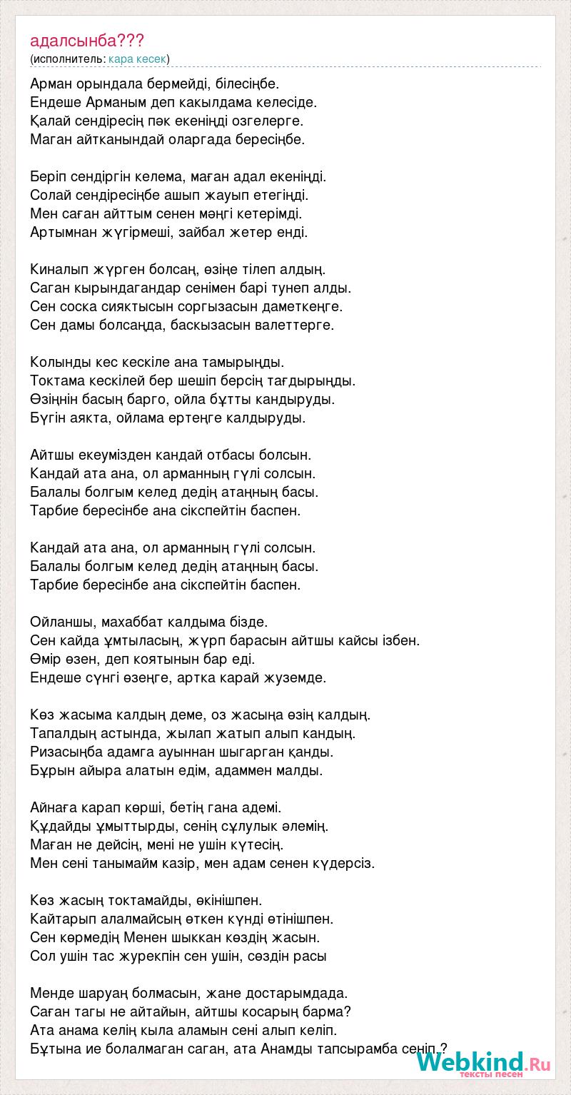 Арман орындала бермейді, білесіңбе. Ендеше Арманым деп какылдама келесіде. Қалай сендіресің пәк екеніңді озгелерге. Маган айтканындай оларгада бересіңбе. Беріп сендіргін келема, маған адал екеніңді. Солай сендіресіңбе ашып жауып етегіңді. Мен саған айттым сенен мәңгі кетерімді. Артымнан жүгірмеші, зайбал жетер енді. Киналып жүрген болсаң, өзіңе тілеп алдың. Саган кырындагандар сенімен барі тунеп алды. Сен соска сияктысын соргызасын даметкеңге. Сен дамы болсаңда, баскызасын валеттерге. Колынды кес кескіле ана тамырыңды. Токтама кескілей бер шешіп берсің тағдырыңды. Өзіңнін басың барго, ойла бұтты кандыруды. Бүгін аякта, ойлама ертеңге калдыруды. Айтшы екеумізден кандай отбасы болсын. Кандай ата ана, ол арманның гүлі солсын. Балалы болгым келед дедің атаңның басы. Тарбие бересінбе ана сікспейтін баспен. Кандай ата ана, ол арманның гүлі солсын. Балалы болгым келед дедің атаңның басы. Тарбие бересінбе ана сікспейтін баспен. Ойланшы, махаббат калдыма бізде. Сен кайда ұмтыласың, жүрп барасын айтшы кайсы ізбен. Өмір өзен, деп коятынын бар еді. Ендеше сүнгі өзеңге, артка карай жуземде. Көз жасыма калдың деме, оз жасыңа өзің калдың. Тапалдың астында, жылап жатып алып кандың. Ризасыңба адамга ауыннан шыгарган қанды. Бұрын айыра алатын едім, адаммен малды. Айнаға карап көрші, бетің гана адемі. Құдайды ұмыттырды, сенің сұлулык әлемің. Маған не дейсің, мені не ушін күтесің. Мен сені танымайм казір, мен адам сенен күдерсіз. Көз жасың токтамайды, өкінішпен. Кайтарып алалмайсың өткен күнді өтінішпен. Сен көрмедің Менен шыккан көздің жасын. Сол ушін тас журекпін сен ушін, сөздін расы Менде шаруаң болмасын, жане достарымдада. Саған тагы не айтайын, айтшы косарың барма? Ата анама келің кыла аламын сені алып келіп. Бұтына ие болалмаган саган, ата Анамды тапсырамба сеніп.?