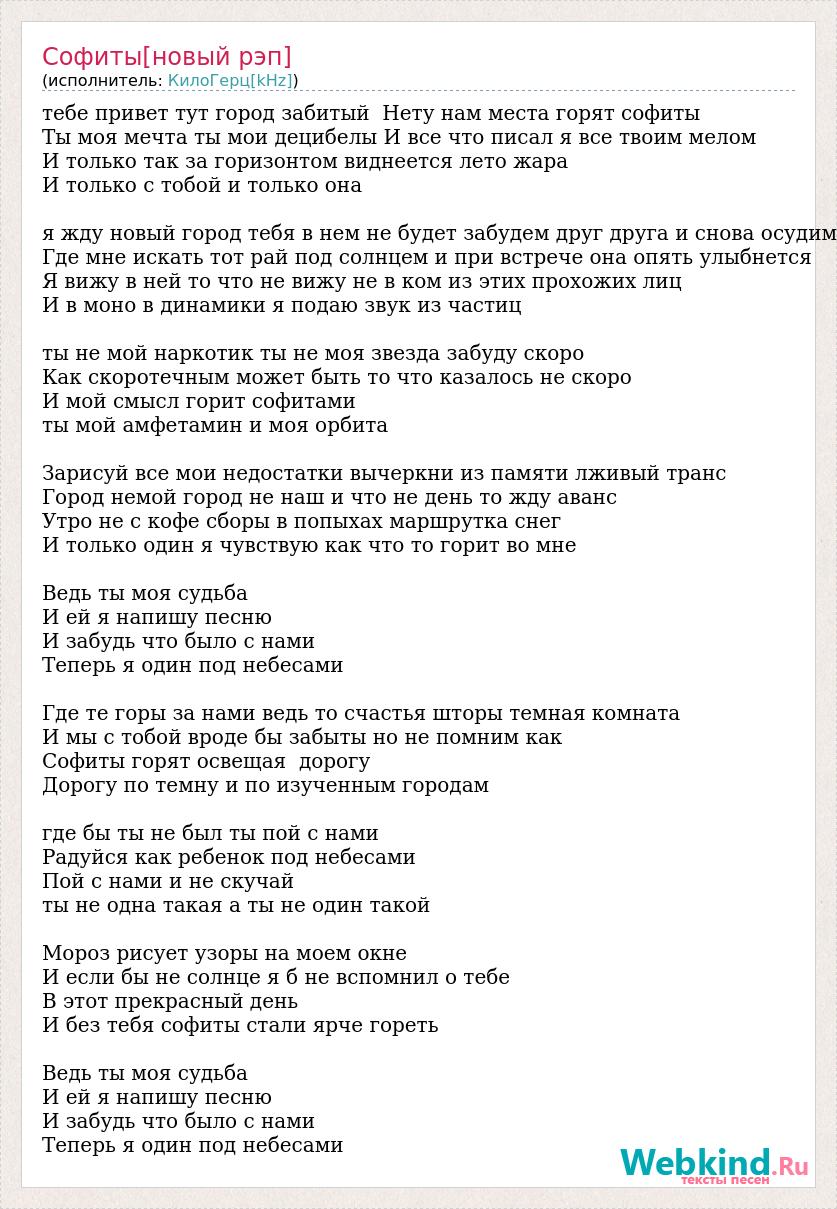 тебе привет тут город забитый Нету нам места горят софиты Ты моя мечта ты мои децибелы И все что писал я все твоим мелом И только так за горизонтом виднеется лето жара И только с тобой и только она я жду новый город тебя в нем не будет забудем друг друга и снова осудим Где мне искать тот рай под солнцем и при встрече она опять улыбнется Я вижу в ней то что не вижу не в ком из этих прохожих лиц И в моно в динамики я подаю звук из частиц ты не мой наркотик ты не моя звезда забуду скоро Как скоротечным может быть то что казалось не скоро И мой смысл горит софитами ты мой амфетамин и моя орбита Зарисуй все мои недостатки вычеркни из памяти лживый транс Город немой город не наш и что не день то жду аванс Утро не с кофе сборы в попыхах маршрутка снег И только один я чувствую как что то горит во мне Ведь ты моя судьба И ей я напишу песню И забудь что было с нами Теперь я один под небесами Где те горы за нами ведь то счастья шторы темная комната И мы с тобой вроде бы забыты но не помним как Софиты горят освещая дорогу Дорогу по темну и по изученным городам где бы ты не был ты пой с нами Радуйся как ребенок под небесами Пой с нами и не скучай ты не одна такая а ты не один такой Мороз рисует узоры на моем окне И если бы не солнце я б не вспомнил о тебе В этот прекрасный день И без тебя софиты стали ярче гореть Ведь ты моя судьба И ей я напишу песню И забудь что было с нами Теперь я один под небесами