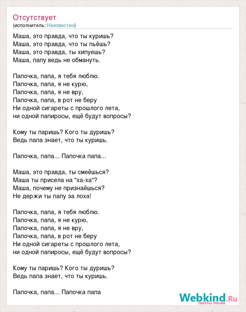Маша, это правда, что ты куришь? Маша, это правда, что ты пьёшь? Маша, это правда, ты хипуешь? Маша, папу ведь не обмануть. Папочка, папа, я тебя люблю. Папочка, папа, я не курю, Папочка, папа, я не вру, Папочка, папа, в рот не беру Ни одной сигареты с прошлого лета, ни одной папиросы, ещё будут вопросы? Кому ты паришь? Кого ты дуришь? Ведь папа знает, что ты куришь. Папочка, папа... Папочка папа... Маша, это правда, ты смеёшься? Маша ты присела на "ха-ха"? Маша, почему не признаёшься? Не держи ты папу за лоха! Папочка, папа, я тебя люблю. Папочка, папа, я не курю, Папочка, папа, я не вру, Папочка, папа, в рот не беру Ни одной сигареты с прошлого лета, ни одной папиросы, ещё будут вопросы? Кому ты паришь? Кого ты дуришь? Ведь папа знает, что ты куришь. Папочка, папа... Папочка папа