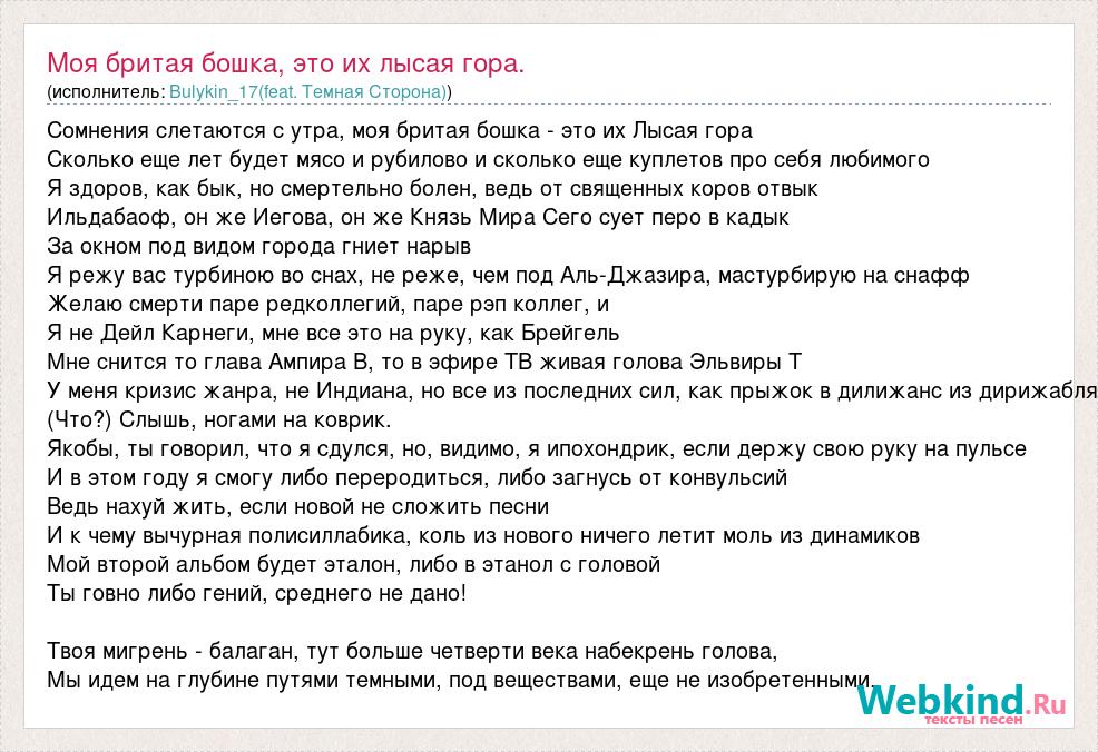 Сомнения слетаются с утра, моя бритая бошка - это их Лысая гора Сколько еще лет будет мясо и рубилово и сколько еще куплетов про себя любимого Я здоров, как бык, но смертельно болен, ведь от священных коров отвык Ильдабаоф, он же Иегова, он же Князь Мира Сего сует перо в кадык За окном под видом города гниет нарыв Я режу вас турбиною во снах, не реже, чем под Аль-Джазира, мастурбирую на снафф Желаю смерти паре редколлегий, паре рэп коллег, и Я не Дейл Карнеги, мне все это на руку, как Брейгель Мне снится то глава Ампира В, то в эфире ТВ живая голова Эльвиры Т У меня кризис жанра, не Индиана, но все из последних сил, как прыжок в дилижанс из дирижабля (Что?) Слышь, ногами на коврик. Якобы, ты говорил, что я сдулся, но, видимо, я ипохондрик, если держу свою руку на пульсе И в этом году я смогу либо переродиться, либо загнусь от конвульсий Ведь нахуй жить, если новой не сложить песни И к чему вычурная полисиллабика, коль из нового ничего летит моль из динамиков Мой второй альбом будет эталон, либо в этанол с головой Ты говно либо гений, среднего не дано! Твоя мигрень - балаган, тут больше четверти века набекрень голова, Мы идем на глубине путями темными, под веществами, еще не изобретенными.