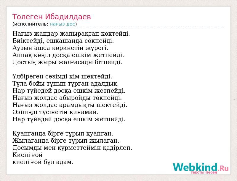 Нағыз жандар жапырақтап көктейді. Биіктейді, ешқашанда сөкпейді. Аузын ашса көринетін жүрегі. Аппақ көңіл досқа ешкім жетпейді. Достың жыры жалғасады бітпейді. Үлбіреген сезімді кім шектейді. Тұла бойы тұнып тұрған адалдық. Нар түйедей досқа ешкім жетпейді. Нағыз жолдас абыройды төкпейді. Нағыз жолдас арамдықты шектейді. Әзіліңді түсінетін қинамай. Нар түйедей досқа ешкім жетпейді. Қуанғанда бірге тұрып қуанған. Жылағанда бірге тұрып жылаған. Досымды мен құрметтеймін қадірлеп. Киелі ғой киелі ғой бұл адам.