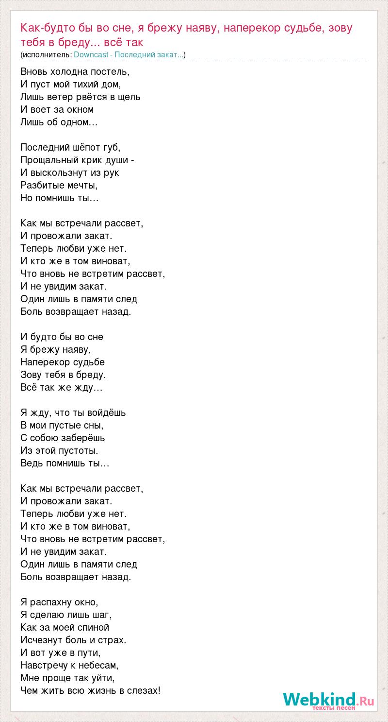 Как-будто бы во сне, я брежу наяву, наперекор судьбе, зову тебя в бреду... всё т