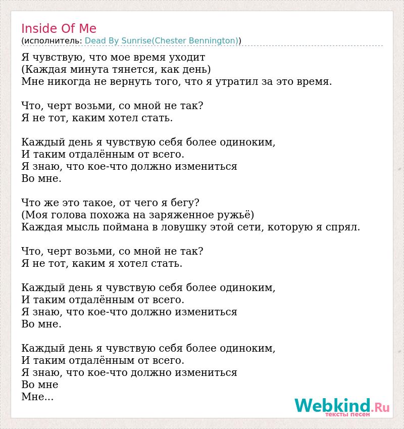 Я чувствую, что мое время уходит (Каждая минута тянется, как день) Мне никогда не вернуть того, что я утратил за это время. Что, черт возьми, со мной не так? Я не тот, каким хотел стать. Каждый день я чувствую себя более одиноким, И таким отдалённым от всего. Я знаю, что кое-что должно измениться Во мне. Что же это такое, от чего я бегу? (Моя голова похожа на заряженное ружьё) Каждая мысль поймана в ловушку этой сети, которую я cпрял. Что, черт возьми, со мной не так? Я не тот, каким я хотел стать. Каждый день я чувствую себя более одиноким, И таким отдалённым от всего. Я знаю, что кое-что должно измениться Во мне. Каждый день я чувствую себя более одиноким, И таким отдалённым от всего. Я знаю, что кое-что должно измениться Во мне Мне...