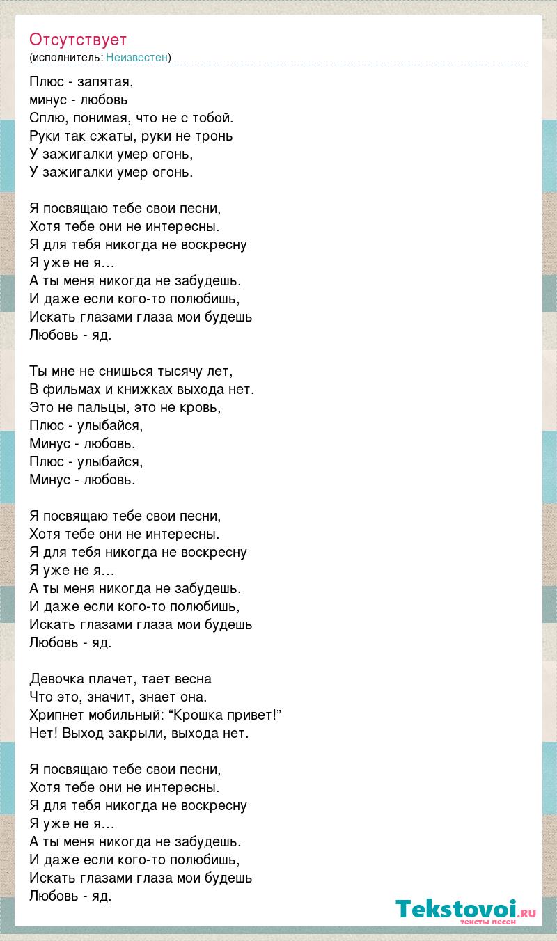 Плюс - запятая, минус - любовь Сплю, понимая, что не с тобой. Руки так сжаты, руки не тронь У зажигалки умер огонь, У зажигалки умер огонь. Я посвящаю тебе свои песни, Хотя тебе они не интересны. Я для тебя никогда не воскресну Я уже не я… А ты меня никогда не забудешь. И даже если кого-то полюбишь, Искать глазами глаза мои будешь Любовь - яд. Ты мне не снишься тысячу лет, В фильмах и книжках выхода нет. Это не пальцы, это не кровь, Плюс - улыбайся, Минус - любовь. Плюс - улыбайся, Минус - любовь. Я посвящаю тебе свои песни, Хотя тебе они не интересны. Я для тебя никогда не воскресну Я уже не я… А ты меня никогда не забудешь. И даже если кого-то полюбишь, Искать глазами глаза мои будешь Любовь - яд. Девочка плачет, тает весна Что это, значит, знает она. Хрипнет мобильный: “Крошка привет!” Нет! Выход закрыли, выхода нет. Я посвящаю тебе свои песни, Хотя тебе они не интересны. Я для тебя никогда не воскресну Я уже не я… А ты меня никогда не забудешь. И даже если кого-то полюбишь, Искать глазами глаза мои будешь Любовь - яд.