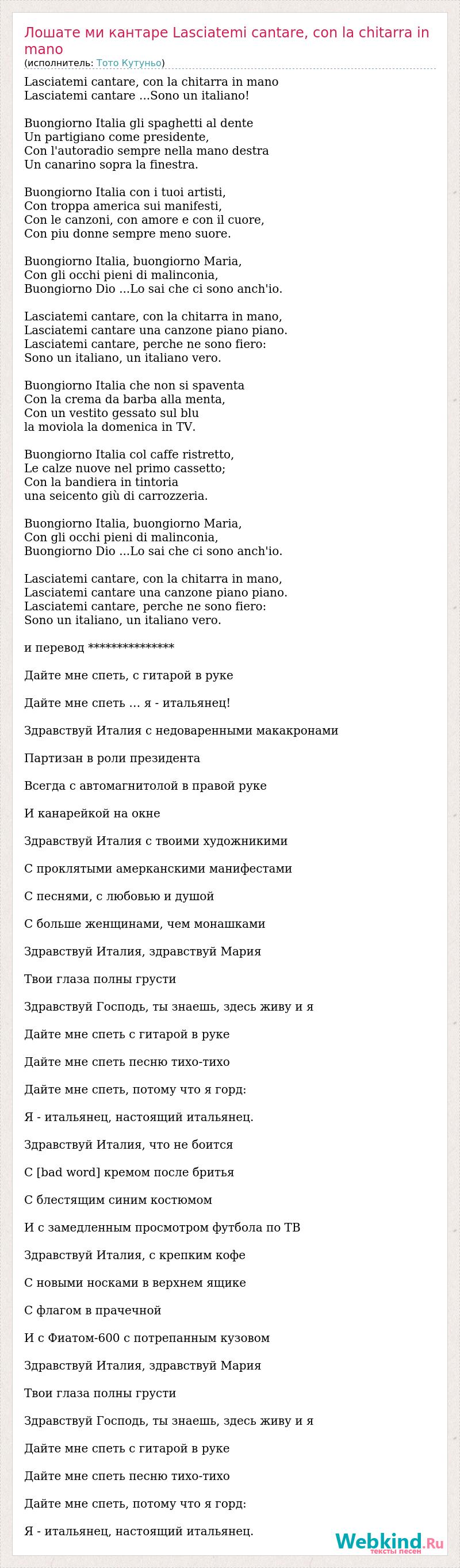 Lasciatemi cantare, con la chitarra in mano Lasciatemi cantare ...Sono un italiano! Buongiorno Italia gli spaghetti al dente Un partigiano come presidente, Con l'autoradio sempre nella mano destra Un canarino sopra la finestra. Buongiorno Italia con i tuoi artisti, Con troppa america sui manifesti, Con le canzoni, con amore e con il cuore, Con piu donne sempre meno suore. Buongiorno Italia, buongiorno Maria, Con gli occhi pieni di malinconia, Buongiorno Dio ...Lo sai che ci sono anch'io. Lasciatemi cantare, con la chitarra in mano, Lasciatemi cantare una canzone piano piano. Lasciatemi cantare, perche ne sono fiero: Sono un italiano, un italiano vero. Buongiorno Italia che non si spaventa Con la crema da barba alla menta, Con un vestito gessato sul blu la moviola la domenica in TV. Buongiorno Italia col caffe ristretto, Le calze nuove nel primo cassetto; Con la bandiera in tintoria una seicento giù di carrozzeria. Buongiorno Italia, buongiorno Maria, Con gli occhi pieni di malinconia, Buongiorno Dio ...Lo sai che ci sono anch'io. Lasciatemi cantare, con la chitarra in mano, Lasciatemi cantare una canzone piano piano. Lasciatemi cantare, perche ne sono fiero: Sono un italiano, un italiano vero. и перевод *************** Дайте мне спеть, с гитарой в руке Дайте мне спеть … я - итальянец! Здравствуй Италия с недоваренными макакронами Партизан в роли президента Всегда с автомагнитолой в правой руке И канарейкой на окне Здравствуй Италия с твоими художникими С проклятыми амерканскими манифестами С песнями, с любовью и душой С больше женщинами, чем монашками Здравствуй Италия, здравствуй Мария Твои глаза полны грусти Здравствуй Господь, ты знаешь, здесь живу и я Дайте мне спеть с гитарой в руке Дайте мне спеть песню тихо-тихо Дайте мне спеть, потому что я горд: Я - итальянец, настоящий итальянец. Здравствуй Италия, что не боится С [bad word] кремом после бритья С блестящим синим костюмом И с замедленным просмотром футбола по ТВ Здравствуй Италия, с крепким кофе С новыми носками в верхнем ящике С флагом в прачечной И с Фиатом-600 с потрепанным кузовом Здравствуй Италия, здравствуй Мария Твои глаза полны грусти Здравствуй Господь, ты знаешь, здесь живу и я Дайте мне спеть с гитарой в руке Дайте мне спеть песню тихо-тихо Дайте мне спеть, потому что я горд: Я - итальянец, настоящий итальянец.