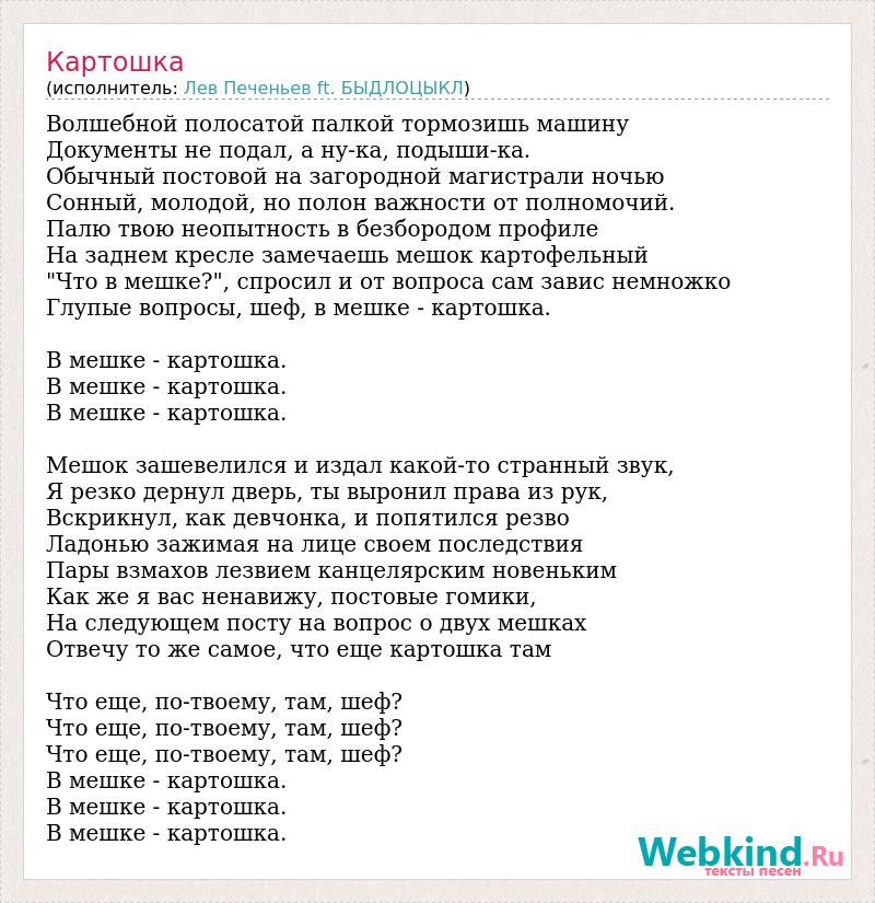 Волшебной полосатой палкой тормозишь машину Документы не подал, а ну-ка, подыши-ка. Обычный постовой на загородной магистрали ночью Сонный, молодой, но полон важности от полномочий. Палю твою неопытность в безбородом профиле На заднем кресле замечаешь мешок картофельный "Что в мешке?", спросил и от вопроса сам завис немножко Глупые вопросы, шеф, в мешке - картошка. В мешке - картошка. В мешке - картошка. В мешке - картошка. Мешок зашевелился и издал какой-то странный звук, Я резко дернул дверь, ты выронил права из рук, Вскрикнул, как девчонка, и попятился резво Ладонью зажимая на лице своем последствия Пары взмахов лезвием канцелярским новеньким Как же я вас ненавижу, постовые гомики, На следующем посту на вопрос о двух мешках Отвечу то же самое, что еще картошка там Что еще, по-твоему, там, шеф? Что еще, по-твоему, там, шеф? Что еще, по-твоему, там, шеф? В мешке - картошка. В мешке - картошка. В мешке - картошка.