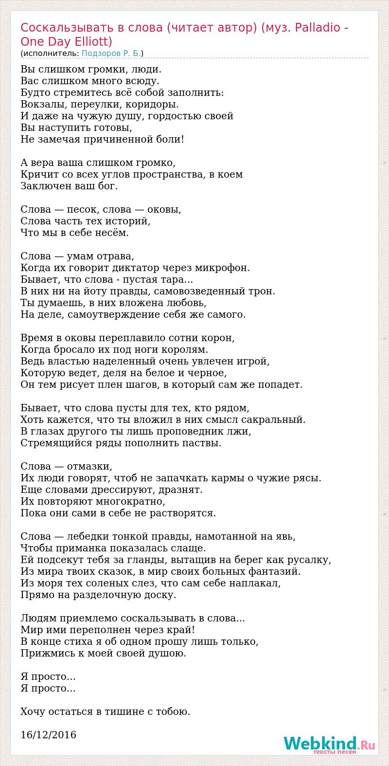 Главная→Исполнители→Подзоров Р. Б.→Соскальзывать в слова (читает автор) (муз. Palladio - One Day Elliott)