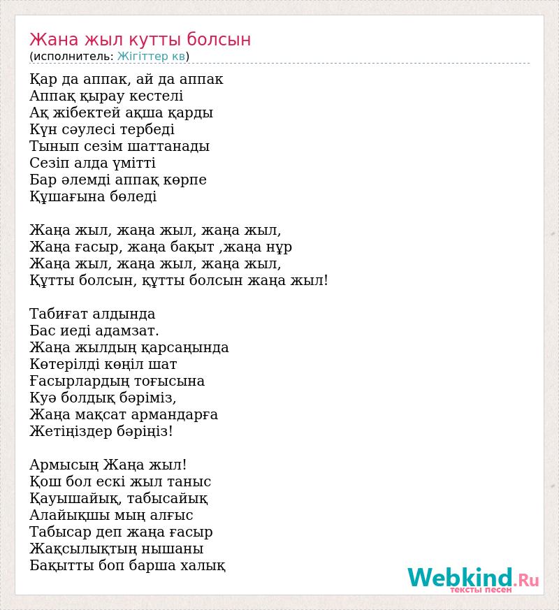 Қар да аппак, ай да аппак Аппақ қырау кестелі Ақ жібектей ақша қарды Күн сәулесі тербеді Тынып сезім шаттанады Сезіп алда үмітті Бар әлемді аппақ көрпе Құшағына бөледі Жаңа жыл, жаңа жыл, жаңа жыл, Жаңа ғасыр, жаңа бақыт ,жаңа нұр Жаңа жыл, жаңа жыл, жаңа жыл, Құтты болсын, құтты болсын жаңа жыл! Табиғат алдында Бас иеді адамзат. Жаңа жылдың қарсаңында Көтерілді көңіл шат Ғасырлардың тоғысына Куә болдық бәріміз, Жаңа мақсат армандарға Жетіңіздер бәріңіз! Армысың Жаңа жыл! Қош бол ескі жыл таныс Қауышайық, табысайық Алайықшы мың алғыс Табысар деп жаңа ғасыр Жақсылықтың нышаны Бақытты боп барша халық