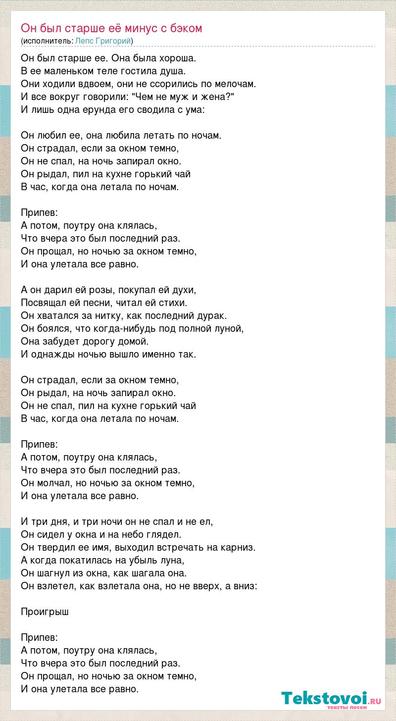 Он был старше ее. Она была хороша. В ее маленьком теле гостила душа. Они ходили вдвоем, они не ссорились по мелочам. И все вокруг говорили: "Чем не муж и жена?" И лишь одна ерунда его сводила с ума: Он любил ее, она любила летать по ночам. Он страдал, если за окном темно, Он не спал, на ночь запирал окно. Он рыдал, пил на кухне горький чай В час, когда она летала по ночам. Припев: А потом, поутру она клялась, Что вчера это был последний раз. Он прощал, но ночью за окном темно, И она улетала все равно. А он дарил ей розы, покупал ей духи, Посвящал ей песни, читал ей стихи. Он хватался за нитку, как последний дурак. Он боялся, что когда-нибудь под полной луной, Она забудет дорогу домой. И однажды ночью вышло именно так. Он страдал, если за окном темно, Он рыдал, на ночь запирал окно. Он не спал, пил на кухне горький чай В час, когда она летала по ночам. Припев: А потом, поутру она клялась, Что вчера это был последний раз. Он молчал, но ночью за окном темно, И она улетала все равно. И три дня, и три ночи он не спал и не ел, Он сидел у окна и на небо глядел. Он твердил ее имя, выходил встречать на карниз. А когда покатилась на убыль луна, Он шагнул из окна, как шагала она. Он взлетел, как взлетала она, но не вверх, а вниз: Проигрыш Припев: А потом, поутру она клялась, Что вчера это был последний раз. Он прощал, но ночью за окном темно, И она улетала все равно.
