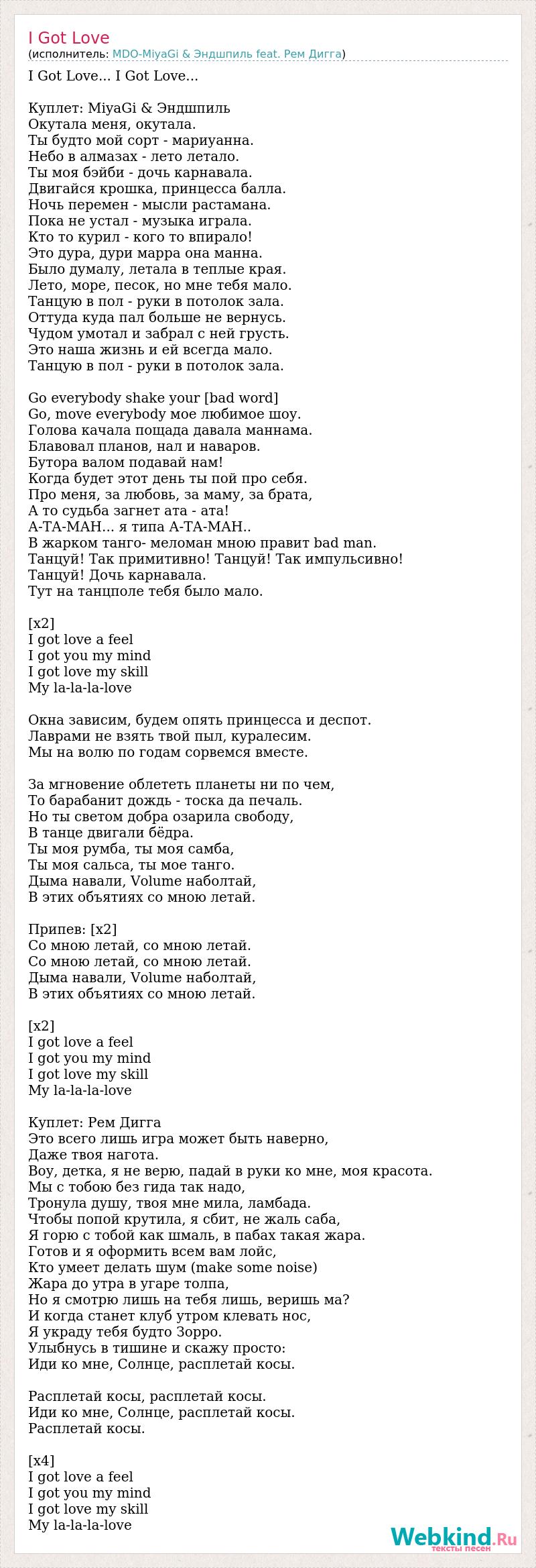 I Got Love... I Got Love... Куплет: MiyaGi & Эндшпиль Окутала меня, окутала. Ты будто мой сорт - мариуанна. Небо в алмазах - лето летало. Ты моя бэйби - дочь карнавала. Двигайся крошка, принцесса балла. Ночь перемен - мысли растамана. Пока не устал - музыка играла. Кто то курил - кого то впирало! Это дура, дури марра она манна. Было думалу, летала в теплые края. Лето, море, песок, но мне тебя мало. Танцую в пол - руки в потолок зала. Оттуда куда пал больше не вернусь. Чудом умотал и забрал с ней грусть. Это наша жизнь и ей всегда мало. Танцую в пол - руки в потолок зала. Go everybody shake your [bad word] Go, move everybody мое любимое шоу. Голова качала пощада давала маннама. Блавовал планов, нал и наваров. Бутора валом подавай нам! Когда будет этот день ты пой про себя. Про меня, за любовь, за маму, за брата, А то судьба загнет ата - ата! А-ТА-МАН... я типа А-ТА-МАН.. В жарком танго- меломан мною правит bad man. Танцуй! Так примитивно! Танцуй! Так импульсивно! Танцуй! Дочь карнавала. Тут на танцполе тебя было мало. [x2] I got love a feel I got you my mind I got love my skill My la-la-la-love Окна зависим, будем опять принцесса и деспот. Лаврами не взять твой пыл, куралесим. Мы на волю по годам сорвемся вместе. За мгновение облететь планеты ни по чем, То барабанит дождь - тоска да печаль. Но ты светом добра озарила свободу, В танце двигали бёдра. Ты моя румба, ты моя самба, Ты моя сальса, ты мое танго. Дыма навали, Volume наболтай, В этих объятиях со мною летай. Припев: [х2] Со мною летай, со мною летай. Со мною летай, со мною летай. Дыма навали, Volume наболтай, В этих объятиях со мною летай. [х2] I got love a feel I got you my mind I got love my skill My la-la-la-love Куплет: Рем Дигга Это всего лишь игра может быть наверно, Даже твоя нагота. Воу, детка, я не верю, падай в руки ко мне, моя красота. Мы с тобою без гида так надо, Тронула душу, твоя мне мила, ламбада. Чтобы попой крутила, я сбит, не жаль саба, Я горю с тобой как шмаль, в пабах такая жара. Готов и я оформить всем вам лойс, Кто умеет делать шум (make some noise) Жара до утра в угаре толпа, Но я смотрю лишь на тебя лишь, веришь ма? И когда станет клуб утром клевать нос, Я украду тебя будто Зорро. Улыбнусь в тишине и скажу просто: Иди ко мне, Солнце, расплетай косы. Расплетай косы, расплетай косы. Иди ко мне, Солнце, расплетай косы. Расплетай косы. [x4] I got love a feel I got you my mind I got love my skill My la-la-la-love