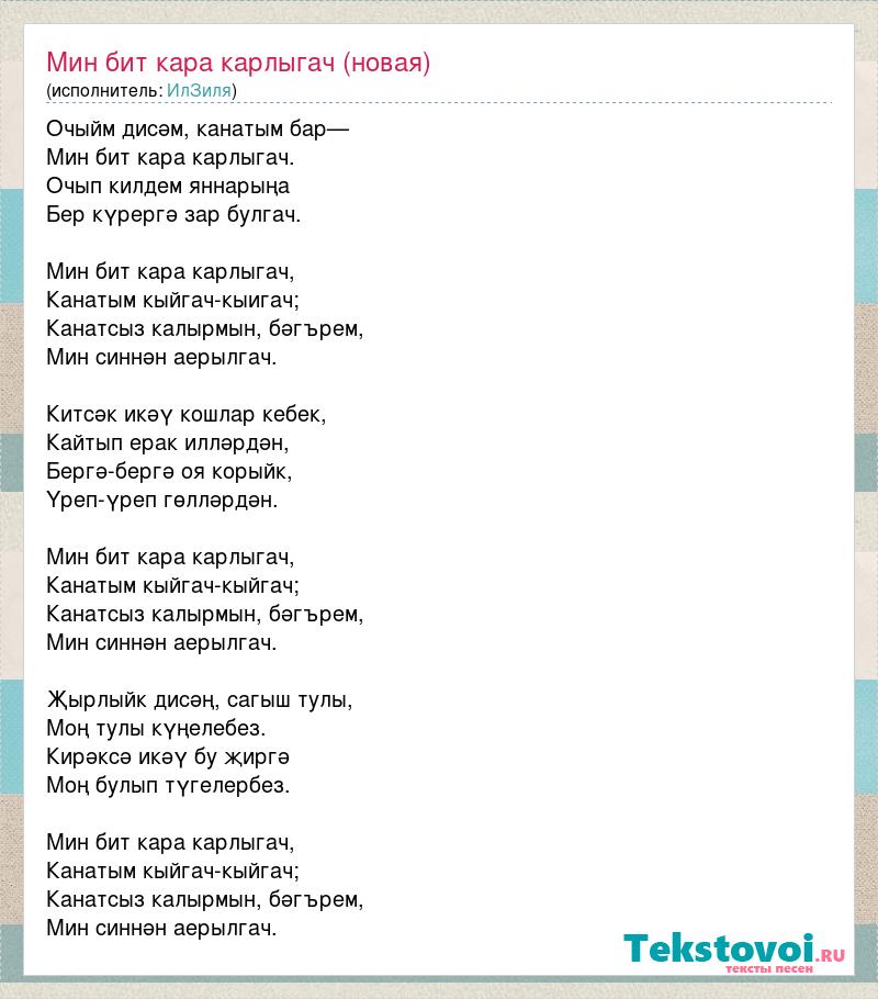 Очыйм дисәм, канатым бар— Мин бит кара карлыгач. Очып килдем яннарыңа Бер күрергә зар булгач. Мин бит кара карлыгач, Канатым кыйгач-кыигач; Канатсыз калырмын, бәгърем, Мин синнән аерылгач. Китсәк икәү кошлар кебек, Кайтып ерак илләрдән, Бергә-бергә оя корыйк, Үреп-үреп гөлләрдән. Мин бит кара карлыгач, Канатым кыйгач-кыйгач; Канатсыз калырмын, бәгърем, Мин синнән аерылгач. Җырлыйк дисәң, сагыш тулы, Моң тулы күңелебез. Кирәксә икәү бу җиргә Моң булып түгелербез. Мин бит кара карлыгач, Канатым кыйгач-кыйгач; Канатсыз калырмын, бәгърем, Мин синнән аерылгач.
