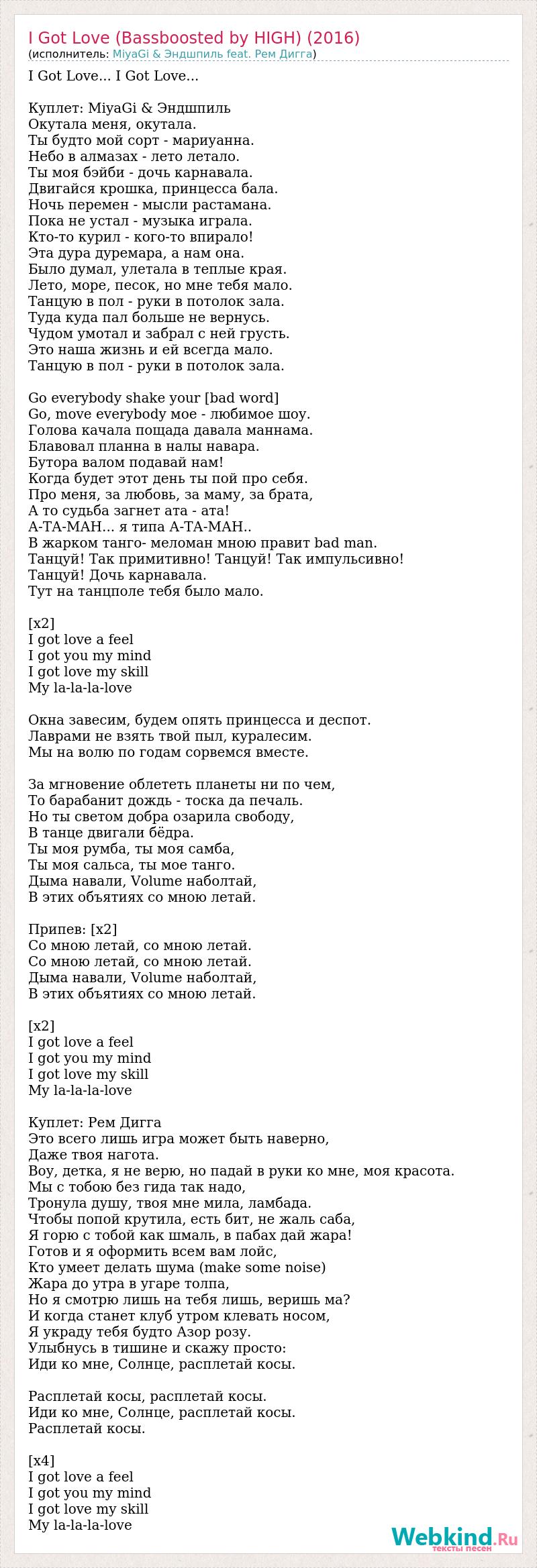 I Got Love... I Got Love... Куплет: MiyaGi & Эндшпиль Окутала меня, окутала. Ты будто мой сорт - мариуанна. Небо в алмазах - лето летало. Ты моя бэйби - дочь карнавала. Двигайся крошка, принцесса бала. Ночь перемен - мысли растамана. Пока не устал - музыка играла. Кто-то курил - кого-то впирало! Эта дура дуремара, а нам она. Было думал, улетала в теплые края. Лето, море, песок, но мне тебя мало. Танцую в пол - руки в потолок зала. Туда куда пал больше не вернусь. Чудом умотал и забрал с ней грусть. Это наша жизнь и ей всегда мало. Танцую в пол - руки в потолок зала. Go everybody shake your [bad word] Go, move everybody мое - любимое шоу. Голова качала пощада давала маннама. Блавовал планна в налы навара. Бутора валом подавай нам! Когда будет этот день ты пой про себя. Про меня, за любовь, за маму, за брата, А то судьба загнет ата - ата! А-ТА-МАН... я типа А-ТА-МАН.. В жарком танго- меломан мною правит bad man. Танцуй! Так примитивно! Танцуй! Так импульсивно! Танцуй! Дочь карнавала. Тут на танцполе тебя было мало. [x2] I got love a feel I got you my mind I got love my skill My la-la-la-love Окна завесим, будем опять принцесса и деспот. Лаврами не взять твой пыл, куралесим. Мы на волю по годам сорвемся вместе. За мгновение облететь планеты ни по чем, То барабанит дождь - тоска да печаль. Но ты светом добра озарила свободу, В танце двигали бёдра. Ты моя румба, ты моя самба, Ты моя сальса, ты мое танго. Дыма навали, Volume наболтай, В этих объятиях со мною летай. Припев: [х2] Со мною летай, со мною летай. Со мною летай, со мною летай. Дыма навали, Volume наболтай, В этих объятиях со мною летай. [х2] I got love a feel I got you my mind I got love my skill My la-la-la-love Куплет: Рем Дигга Это всего лишь игра может быть наверно, Даже твоя нагота. Воу, детка, я не верю, но падай в руки ко мне, моя красота. Мы с тобою без гида так надо, Тронула душу, твоя мне мила, ламбада. Чтобы попой крутила, есть бит, не жаль саба, Я горю с тобой как шмаль, в пабах дай жара! Готов и я оформить всем вам лойс, Кто умеет делать шума (make some noise) Жара до утра в угаре толпа, Но я смотрю лишь на тебя лишь, веришь ма? И когда станет клуб утром клевать носом, Я украду тебя будто Азор розу. Улыбнусь в тишине и скажу просто: Иди ко мне, Солнце, расплетай косы. Расплетай косы, расплетай косы. Иди ко мне, Солнце, расплетай косы. Расплетай косы. [x4] I got love a feel I got you my mind I got love my skill My la-la-la-love