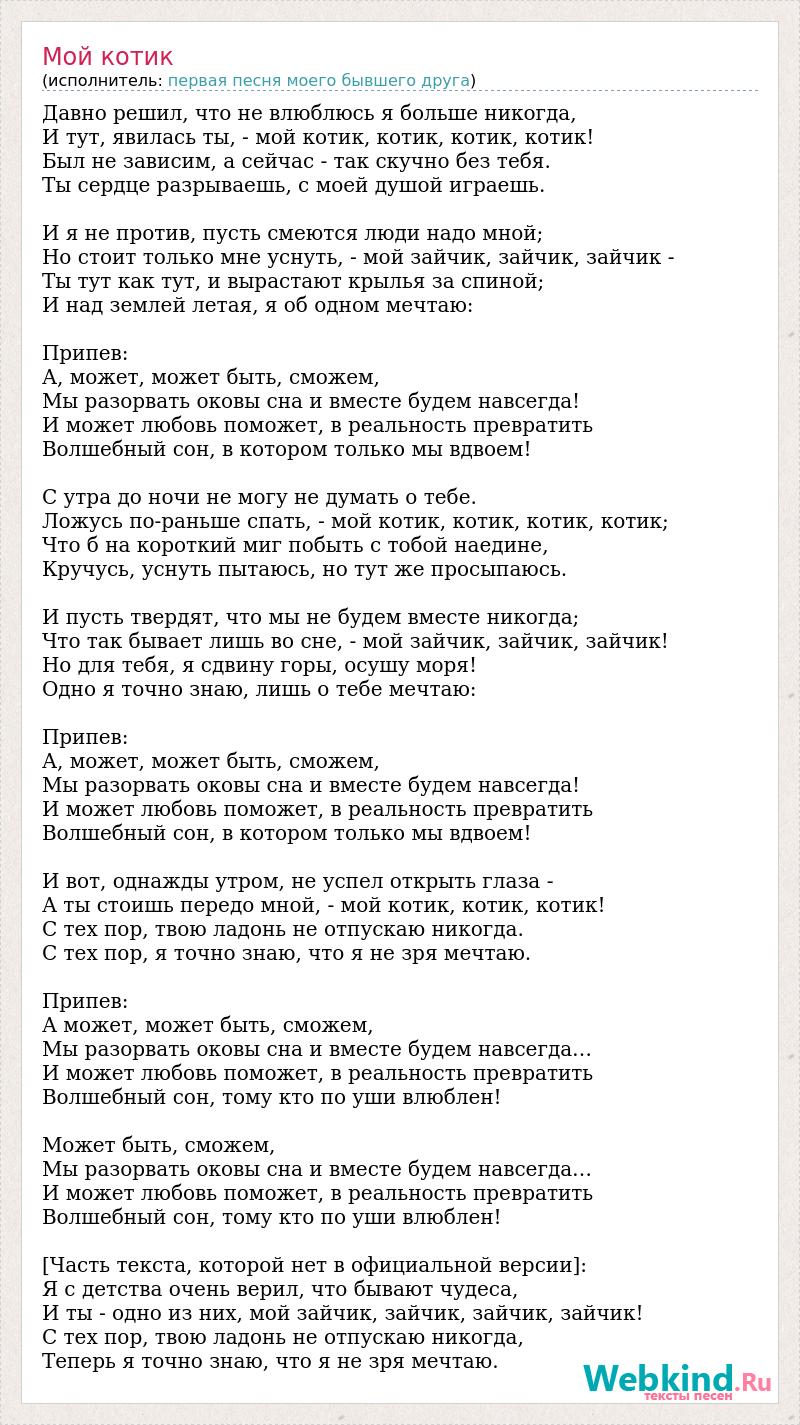 Давно решил, что не влюблюсь я больше никогда, И тут, явилась ты, - мой котик, котик, котик, котик! Был не зависим, а сейчас - так скучно без тебя. Ты сердце разрываешь, с моей душой играешь. И я не против, пусть смеются люди надо мной; Но стоит только мне уснуть, - мой зайчик, зайчик, зайчик - Ты тут как тут, и вырастают крылья за спиной; И над землей летая, я об одном мечтаю: Припев: А, может, может быть, сможем, Мы разорвать оковы сна и вместе будем навсегда! И может любовь поможет, в реальность превратить Волшебный сон, в котором только мы вдвоем! С утра до ночи не могу не думать о тебе. Ложусь по-раньше спать, - мой котик, котик, котик, котик; Что б на короткий миг побыть с тобой наедине, Кручусь, уснуть пытаюсь, но тут же просыпаюсь. И пусть твердят, что мы не будем вместе никогда; Что так бывает лишь во сне, - мой зайчик, зайчик, зайчик! Но для тебя, я сдвину горы, осушу моря! Одно я точно знаю, лишь о тебе мечтаю: Припев: А, может, может быть, сможем, Мы разорвать оковы сна и вместе будем навсегда! И может любовь поможет, в реальность превратить Волшебный сон, в котором только мы вдвоем! И вот, однажды утром, не успел открыть глаза - А ты стоишь передо мной, - мой котик, котик, котик! С тех пор, твою ладонь не отпускаю никогда. С тех пор, я точно знаю, что я не зря мечтаю. Припев: А может, может быть, сможем, Мы разорвать оковы сна и вместе будем навсегда… И может любовь поможет, в реальность превратить Волшебный сон, тому кто по уши влюблен! Может быть, сможем, Мы разорвать оковы сна и вместе будем навсегда… И может любовь поможет, в реальность превратить Волшебный сон, тому кто по уши влюблен! [Часть текста, которой нет в официальной версии]: Я с детства очень верил, что бывают чудеса, И ты - одно из них, мой зайчик, зайчик, зайчик, зайчик! С тех пор, твою ладонь не отпускаю никогда, Теперь я точно знаю, что я не зря мечтаю.