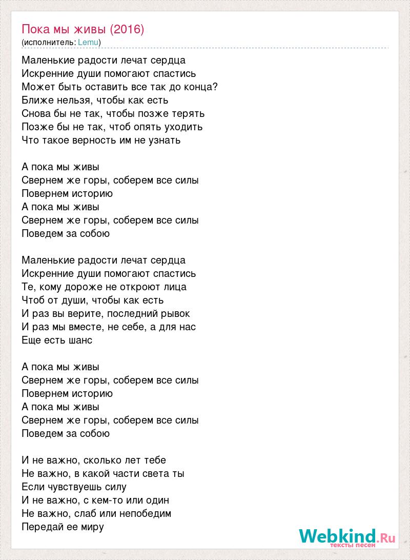 Маленькие радости лечат сердца Искренние души помогают спастись Может быть оставить все так до конца? Ближе нельзя, чтобы как есть Снова бы не так, чтобы позже терять Позже бы не так, чтоб опять уходить Что такое верность им не узнать А пока мы живы Свернем же горы, соберем все силы Повернем историю А пока мы живы Свернем же горы, соберем все силы Поведем за собою Маленькие радости лечат сердца Искренние души помогают спастись Те, кому дороже не откроют лица Чтоб от души, чтобы как есть И раз вы верите, последний рывок И раз мы вместе, не себе, а для нас Еще есть шанс А пока мы живы Свернем же горы, соберем все силы Повернем историю А пока мы живы Свернем же горы, соберем все силы Поведем за собою И не важно, сколько лет тебе Не важно, в какой части света ты Если чувствуешь силу И не важно, с кем-то или один Не важно, слаб или непобедим Передай ее миру