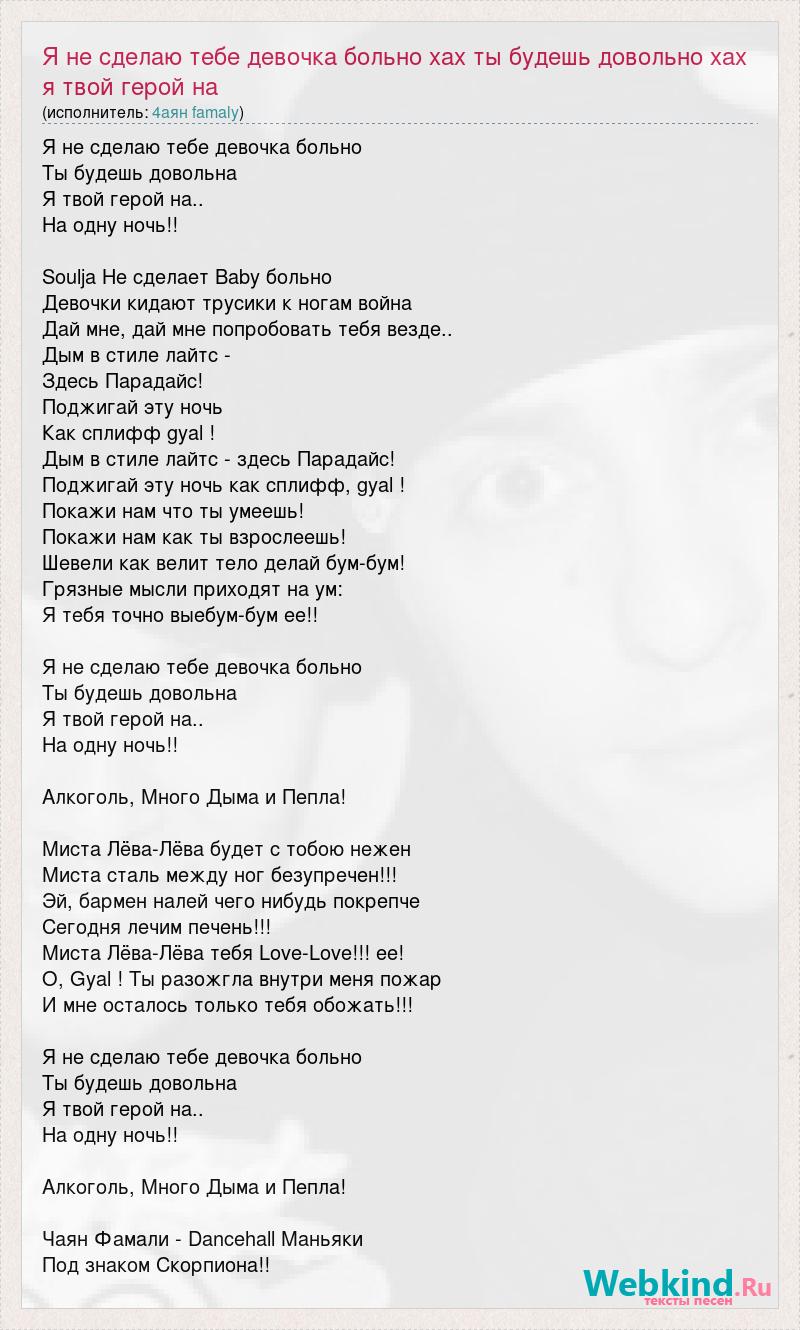 Я не сделаю тебе девочка больно Ты будешь довольна Я твой герой на.. На одну ночь!! Soulja Не сделает Baby больно Девочки кидают трусики к ногам война Дай мне, дай мне попробовать тебя везде.. Дым в стиле лайтс - Здесь Парадайс! Поджигай эту ночь Как сплифф gyal ! Дым в стиле лайтс - здесь Парадайс! Поджигай эту ночь как сплифф, gyal ! Покажи нам что ты умеешь! Покажи нам как ты взрослеешь! Шевели как велит тело делай бум-бум! Грязные мысли приходят на ум: Я тебя точно выебум-бум ее!! Я не сделаю тебе девочка больно Ты будешь довольна Я твой герой на.. На одну ночь!! Алкоголь, Много Дыма и Пепла! Миста Лёва-Лёва будет с тобою нежен Миста сталь между ног безупречен!!! Эй, бармен налей чего нибудь покрепче Сегодня лечим печень!!! Миста Лёва-Лёва тебя Love-Love!!! ее! O, Gyal ! Ты разожгла внутри меня пожар И мне осталось только тебя обожать!!! Я не сделаю тебе девочка больно Ты будешь довольна Я твой герой на.. На одну ночь!! Алкоголь, Много Дыма и Пепла! Чаян Фамали - Dancehall Маньяки Под знаком Скорпиона!!
