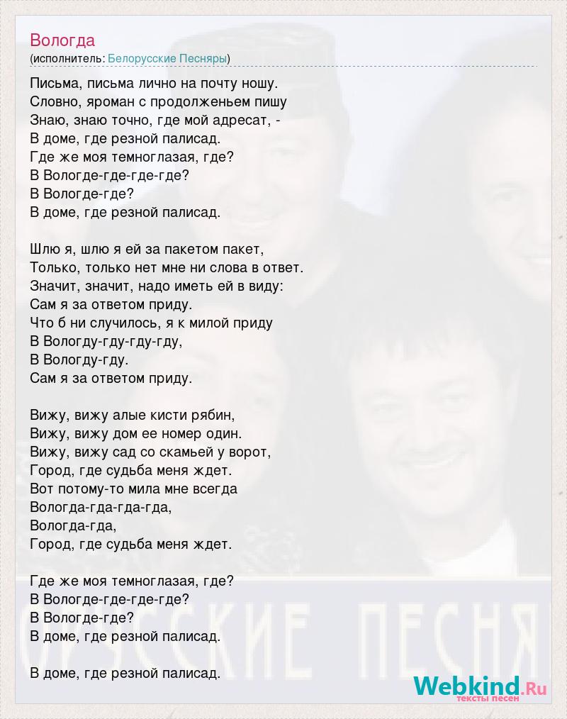 Письма, письма лично на почту ношу. Словно, яроман с продолженьем пишу Знаю, знаю точно, где мой адресат, - В доме, где резной палисад. Где же моя темноглазая, где? В Вологде-где-где-где? В Вологде-где? В доме, где резной палисад. Шлю я, шлю я ей за пакетом пакет, Только, только нет мне ни слова в ответ. Значит, значит, надо иметь ей в виду: Сам я за ответом приду. Что б ни случилось, я к милой приду В Вологду-гду-гду-гду, В Вологду-гду. Сам я за ответом приду. Вижу, вижу алые кисти рябин, Вижу, вижу дом ее номер один. Вижу, вижу сад со скамьей у ворот, Город, где судьба меня ждет. Вот потому-то мила мне всегда Вологда-гда-гда-гда, Вологда-гда, Город, где судьба меня ждет. Где же моя темноглазая, где? В Вологде-где-где-где? В Вологде-где? В доме, где резной палисад. В доме, где резной палисад.