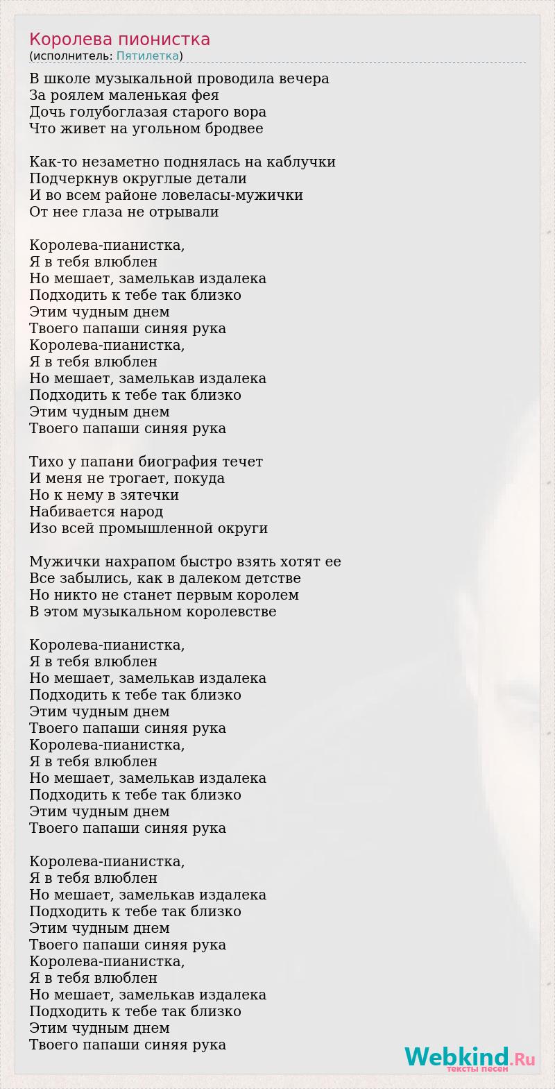 В школе музыкальной проводила вечера За роялем маленькая фея Дочь голубоглазая старого вора Что живет на угольном бродвее Как-то незаметно поднялась на каблучки Подчеркнув округлые детали И во всем районе ловеласы-мужички От нее глаза не отрывали Королева-пианистка, Я в тебя влюблен Но мешает, замелькав издалека Подходить к тебе так близко Этим чудным днем Твоего папаши синяя рука Королева-пианистка, Я в тебя влюблен Но мешает, замелькав издалека Подходить к тебе так близко Этим чудным днем Твоего папаши синяя рука Тихо у папани биография течет И меня не трогает, покуда Но к нему в зятечки Набивается народ Изо всей промышленной округи Мужички нахрапом быстро взять хотят ее Все забылись, как в далеком детстве Но никто не станет первым королем В этом музыкальном королевстве Королева-пианистка, Я в тебя влюблен Но мешает, замелькав издалека Подходить к тебе так близко Этим чудным днем Твоего папаши синяя рука Королева-пианистка, Я в тебя влюблен Но мешает, замелькав издалека Подходить к тебе так близко Этим чудным днем Твоего папаши синяя рука Королева-пианистка, Я в тебя влюблен Но мешает, замелькав издалека Подходить к тебе так близко Этим чудным днем Твоего папаши синяя рука Королева-пианистка, Я в тебя влюблен Но мешает, замелькав издалека Подходить к тебе так близко Этим чудным днем Твоего папаши синяя рука